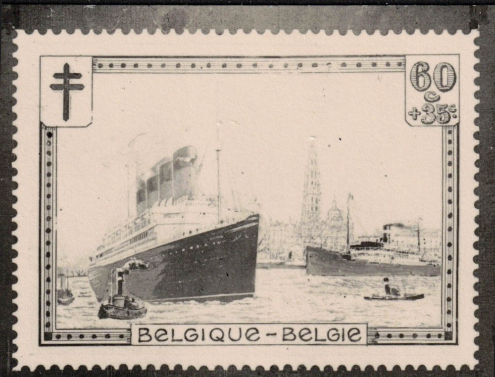 Sites - Port d'Anvers, vue identique à celle du timbre émis mais sans Antwerpen/Anvers et avec chiffre de la valeur 60c + 35c. Epreuve photographique à la dimension du timbre poste du projet dessiné par J. De Bast. En brun sépia sur papier photo épais. Dr J. Stes 3917.