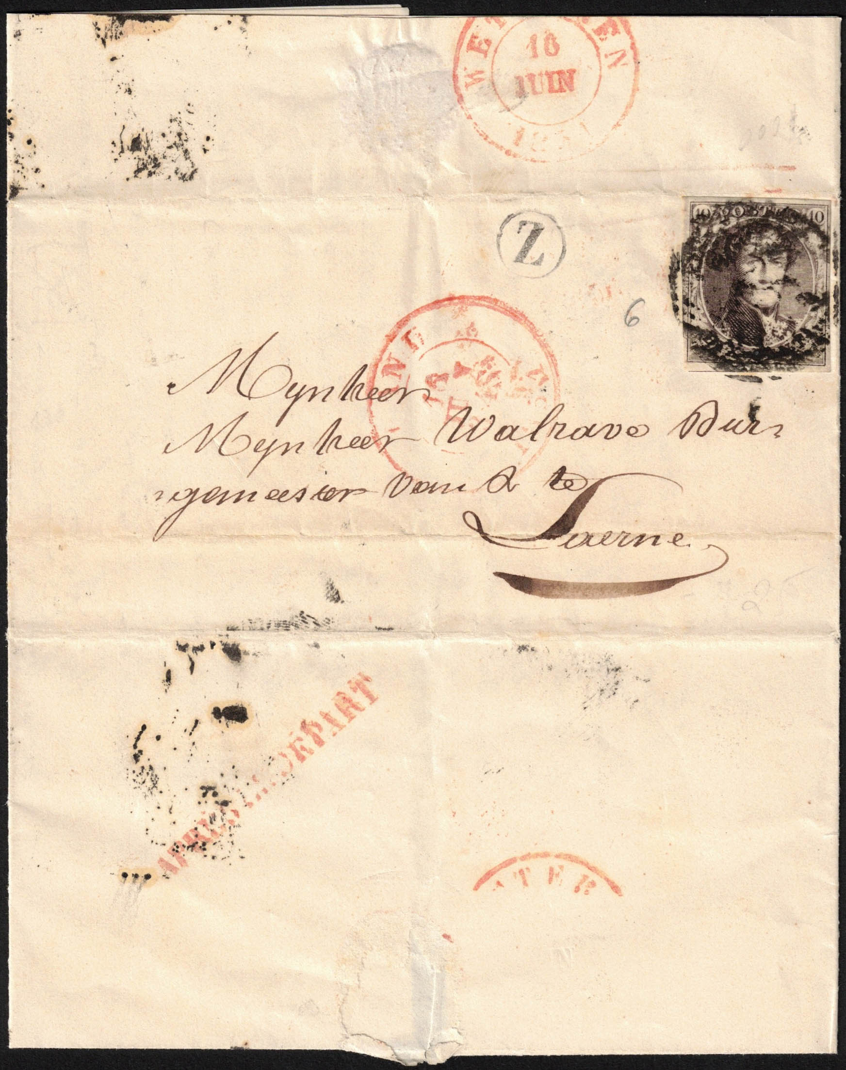 6 margé obl P 45 + càd Gand 16/6/51, boite Z de Seveneecken, griffe en rouge au verso 'Après le départ', LAC vers Laerne, càd Wetteren 16/6 au verso.'