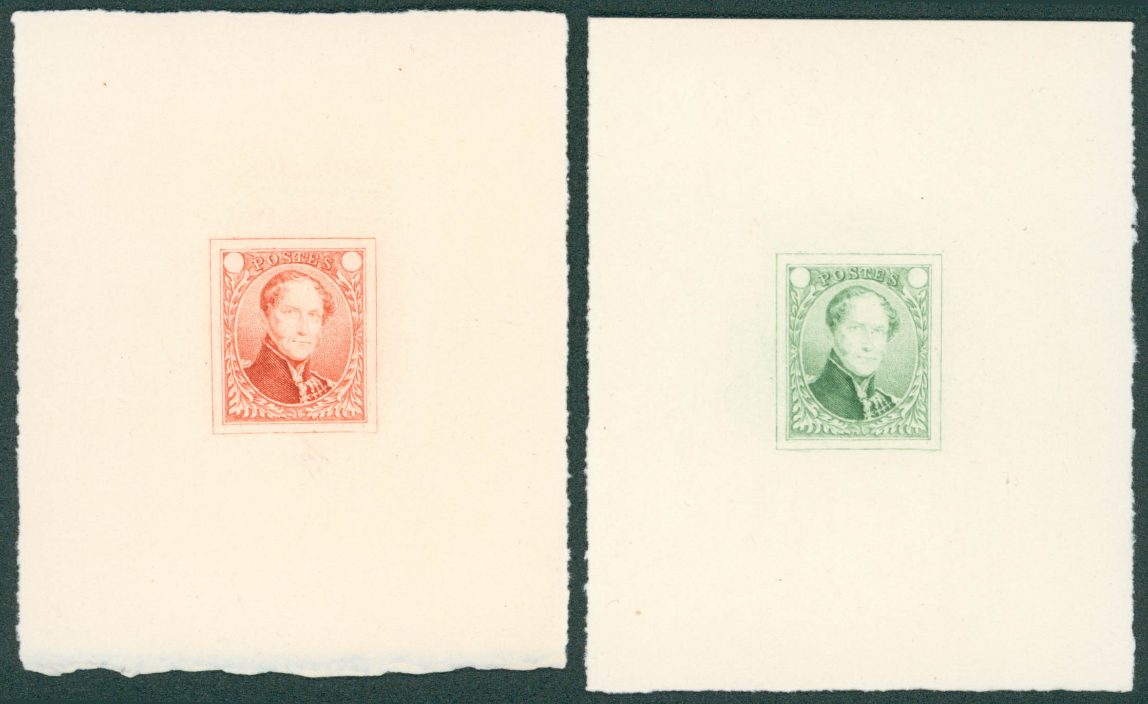 Léopold Ier - 'Médaillons' - Tirages privés en vert et en rouge sur papier grené de l'essai de Delpierre (non adopté).'