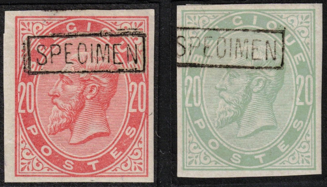 Léopold II - Epreuves des planches sur papier blanc (essais de couleurs), toutes avec 'Spécimen' encadré en noir, en bleu foncé, vert/jaune, orange pâle et vert/jaune pâle. Dr J. Stes 1872-1874-1873 et 1873(var).'