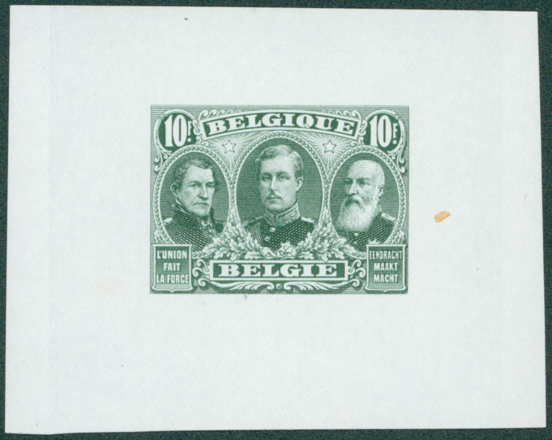 Emission 1915 - Troisième état de gravure, 10F vert sur papier blanc avec la légende 'Eendracht' (adopté). Dr J. Stes 2960 indice 5. Très rare !!'