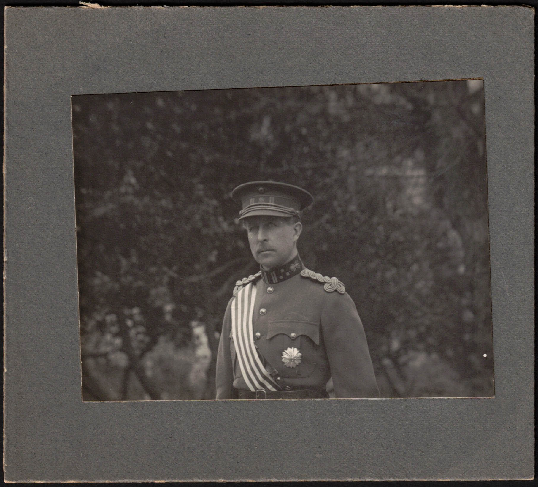1931/32 - Roi Albert Ier Képi 1F - Photo B fournie par la Cour à la firme Malvaux en vue de réalisation du timbre en héliogravure du 1F képi. Après des retouches apportées à la photo par Malvaux, cette photo représentant le souverain de profil 1/4 à gauche sera retenue pour la réalisation de la maquette définitive du 1F képi. R.