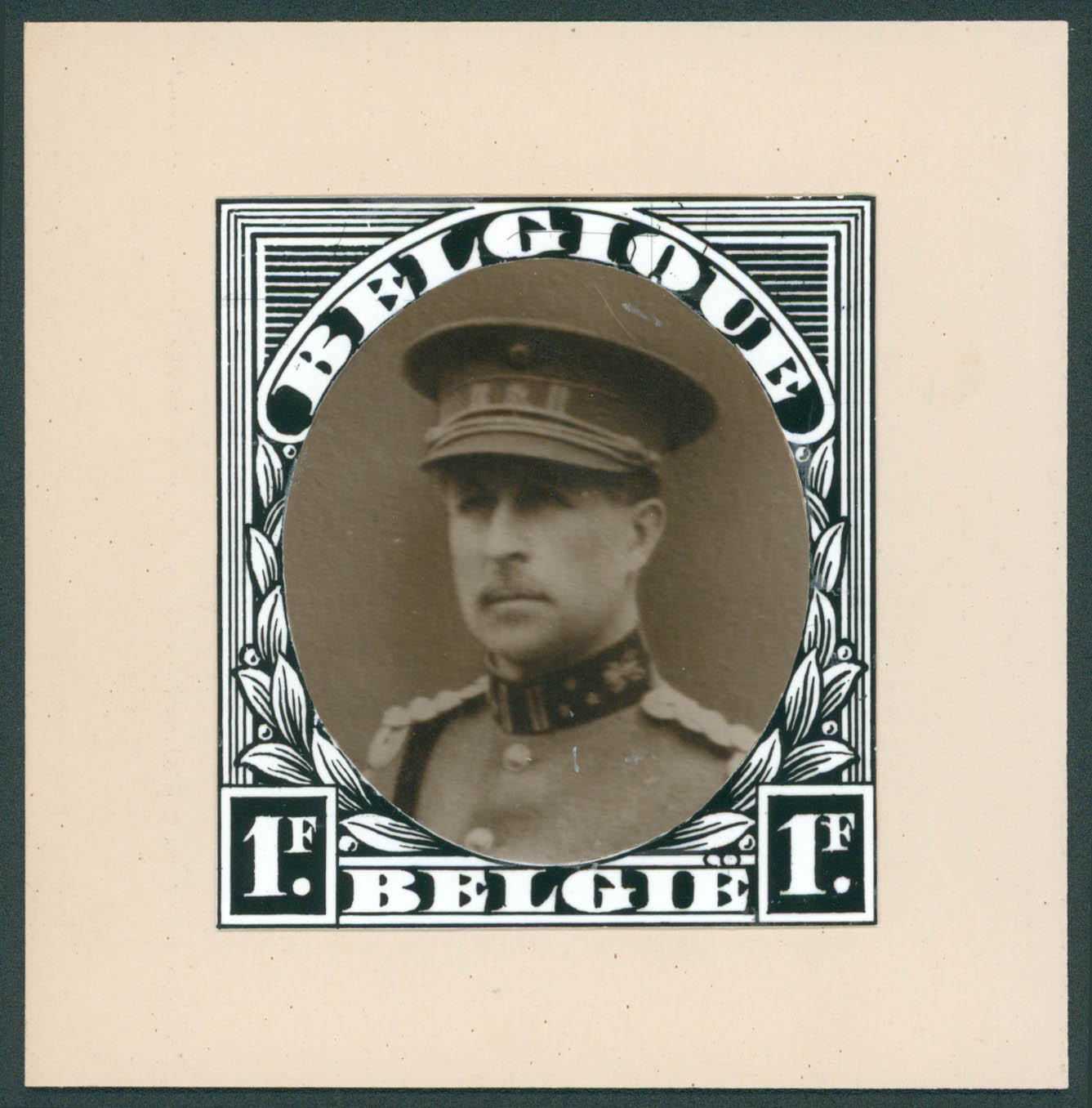 1931/2 - Roi Albert Ier Képi 1F - Maquette définitive par la firme J. Malvaux. Collage de la photo B définitive en ovale au centre de la reproduction photographique de l'encadrement en noir. La maquette servira à la réalistion du 1F en héliogravure. Pièce fondamentale de genèse. R.R.