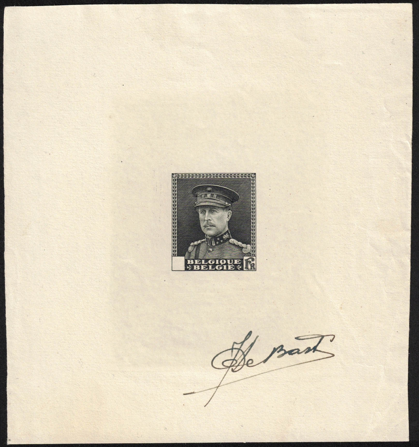 Albert Ier avec képi - Profil à gauche - Epreuve du coin sans indication de la valeur, en noir sur papier moyen, feuillet 10x10,5 cm. Signé J. De Bast.
