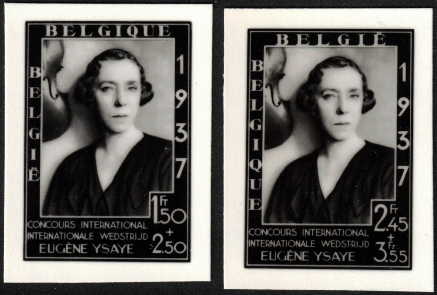 Fondation musicale Reine Elisabeth - Type 'Ysaye' - Grand format pour la réalisation du BF 7. Epreuves photographiques de la maquette définitive des 2 valeurs (1,50F + 2,50F et 2,45F + 3,55F) par la firme Malvaux, en noir sur papier photo blanc épais.'