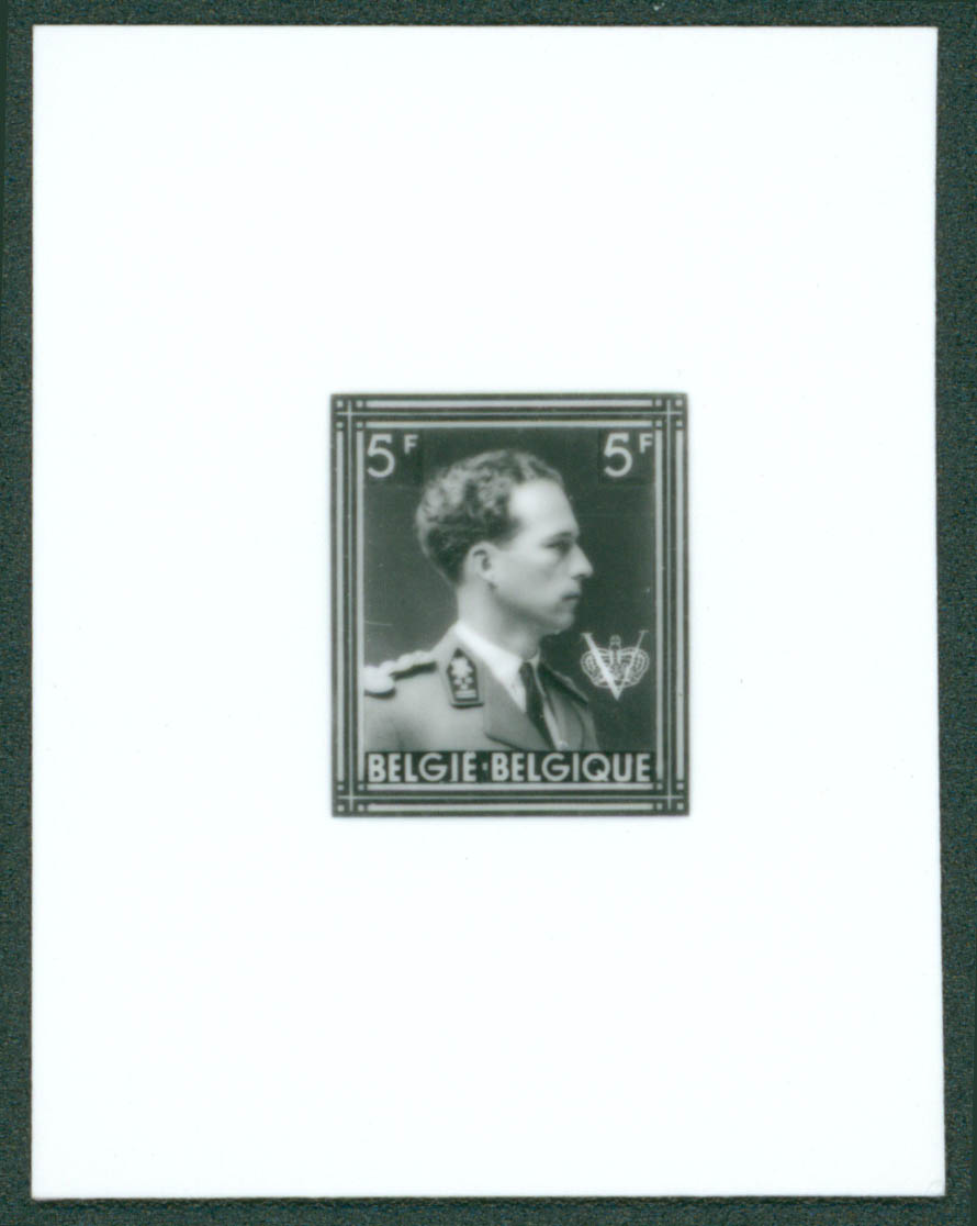 Léopold III col ouvert avec 'V' et couronne - Epreuve photographique de la maquette définitive du 5F par la firme Malvaux en noir sur papier photo blanc épais.'