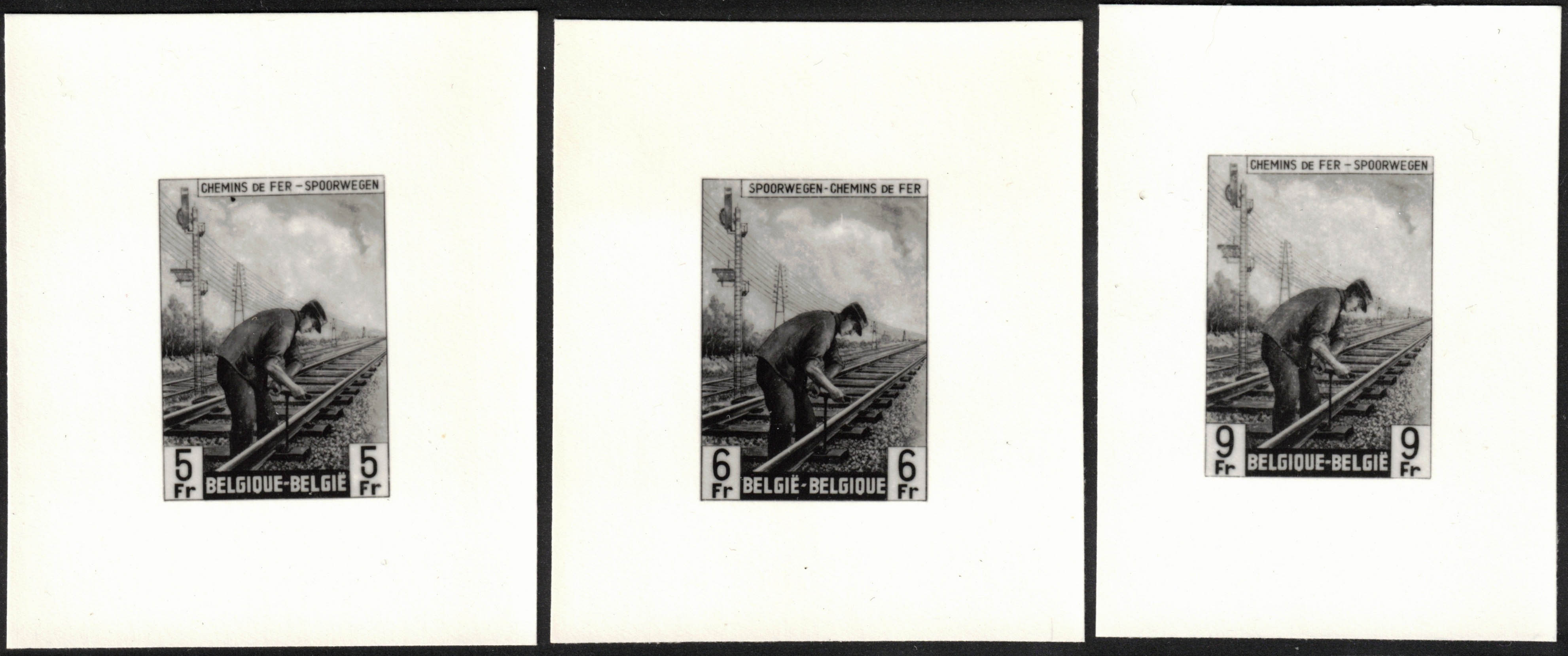 Chemins de Fer 'Métiers divers', type 'piocheur' (CF 277, 278 et 281, 5-6-9F) - Epreuves photographiques des projets définitifs en noir sur papier photo épais.'