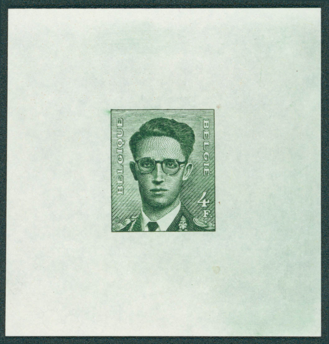 Roi Baudouin avec lunettes - Projet de J. De Bast initialement adopté mais finalement non émis. Epreuve du coin en taille douce, 4F vert, feuillet 65x65 mm.