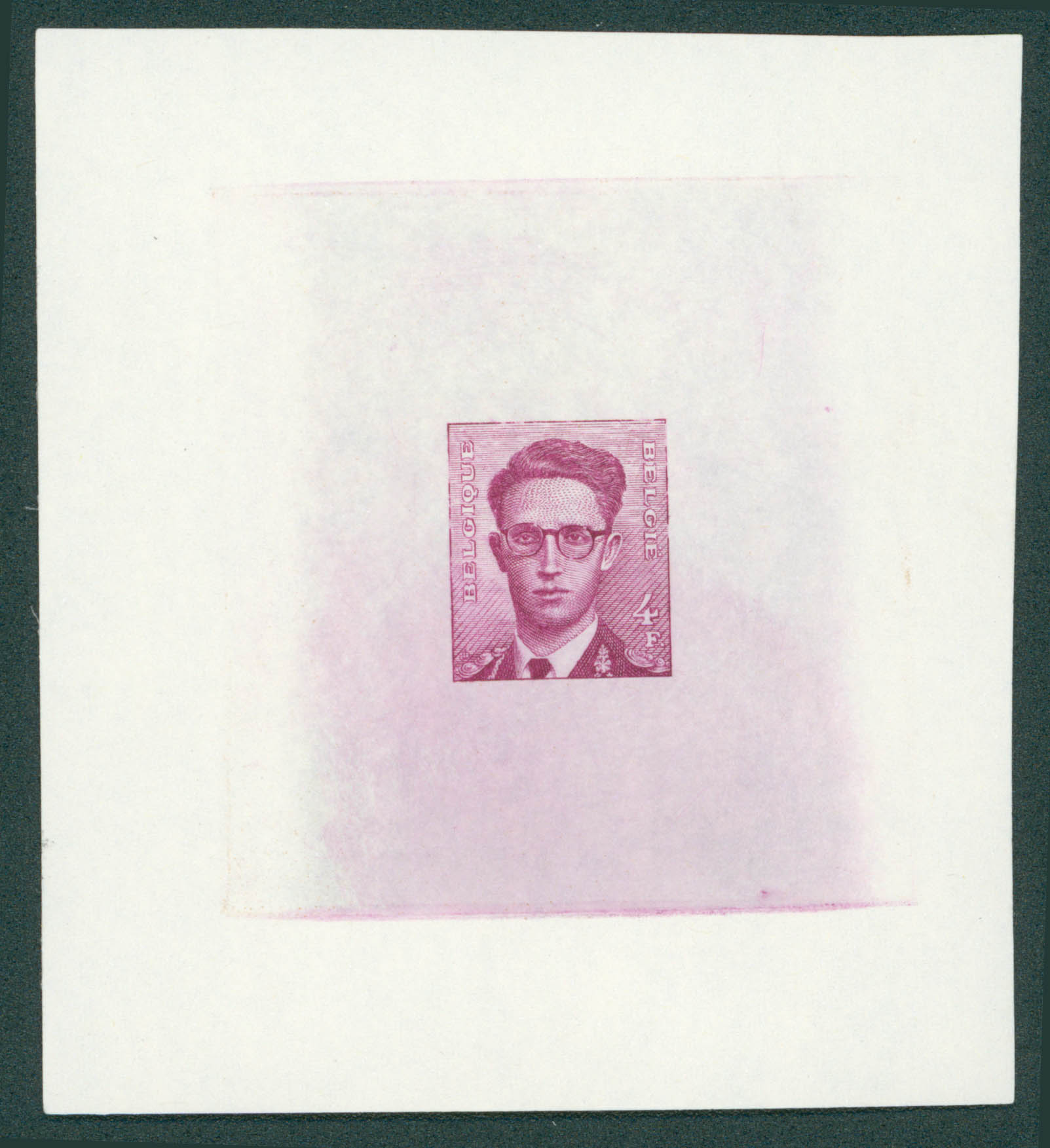 Roi Baudouin avec lunettes - Projet de J. De Bast initialement adopté mais finalement non émis. Epreuve du coin gravé en taille douce en lilaf foncé sur grand feuillet papier crème.