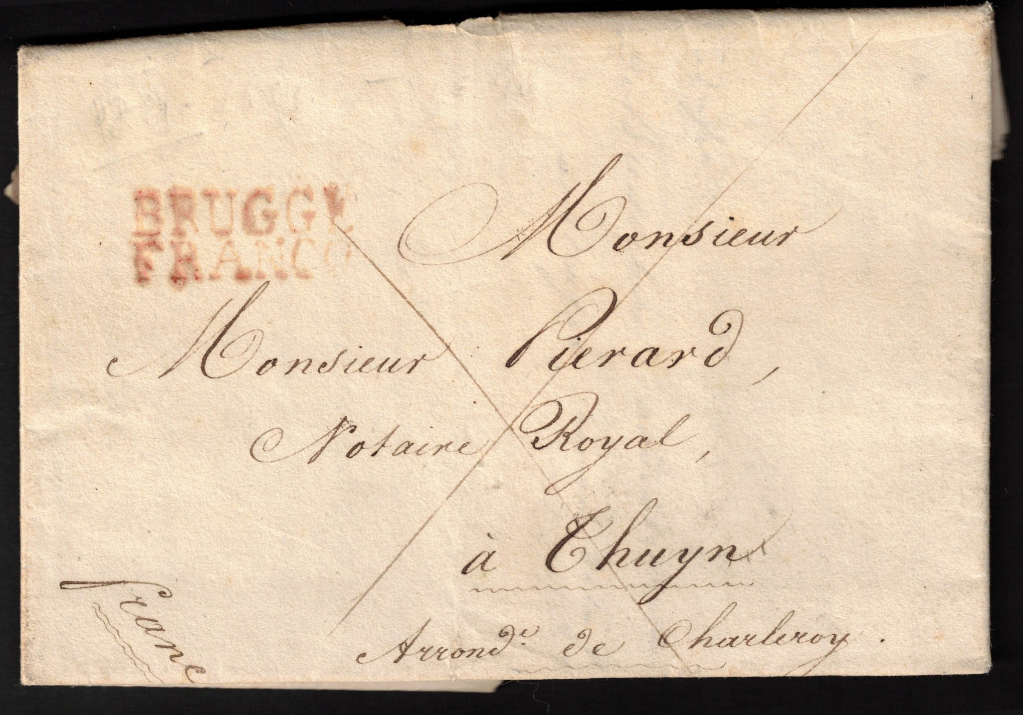LAC datée du 8/8/1821, griffe en rouge 'Brugge/Franco' vers Thuyn. TB'