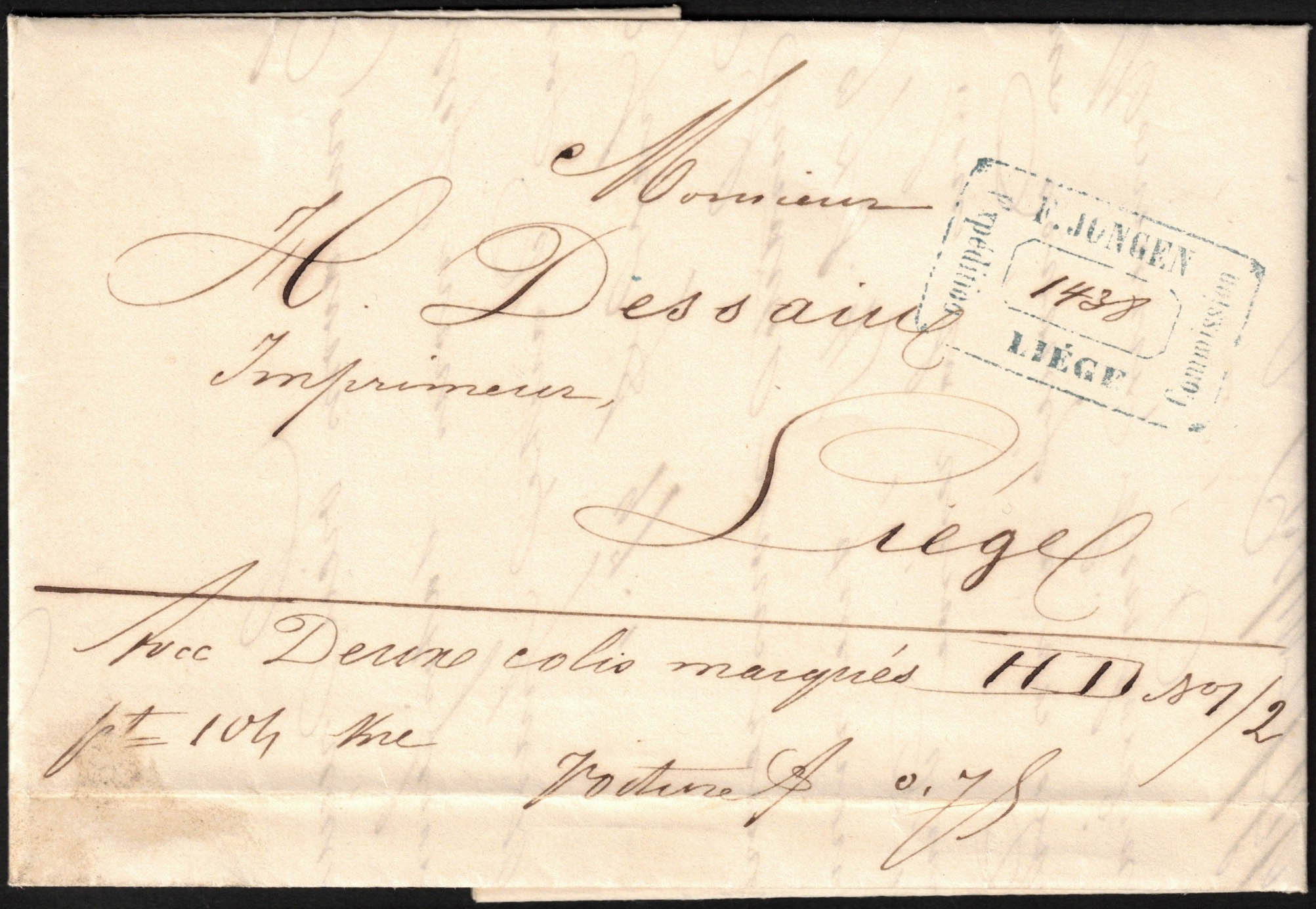LAC (facture de JL Godin et Fils, papeteries) datée du 11/3/1847 de Huy vers Liège. Cachet de l'achemineur F. Jongen, par la barque Chainaye-Gillard.