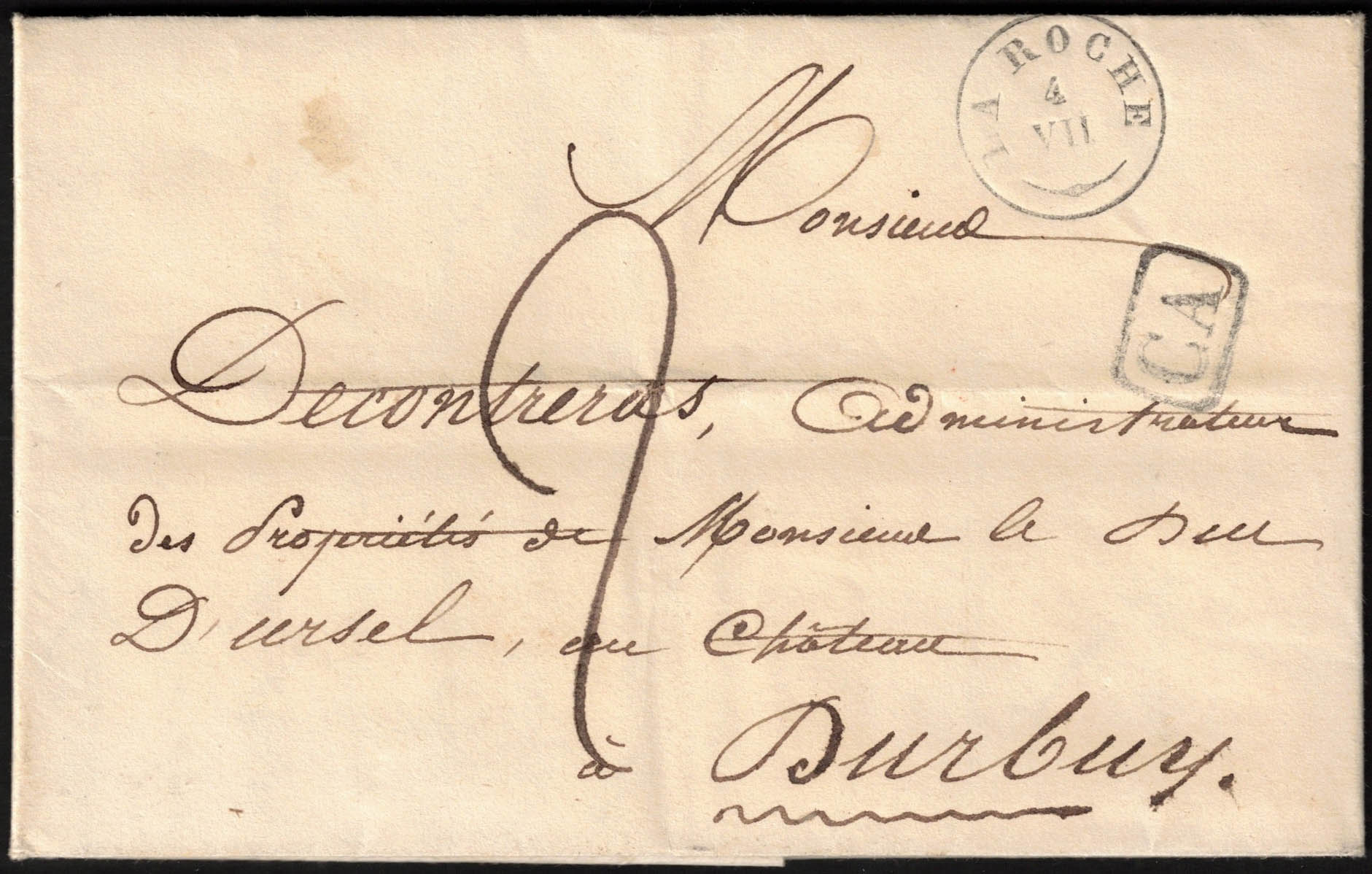 LAC de Laroche, càd T 18 du 4/7/1839 + griffe CA, vers Durbuy via T 18 de Barvaux (verso).