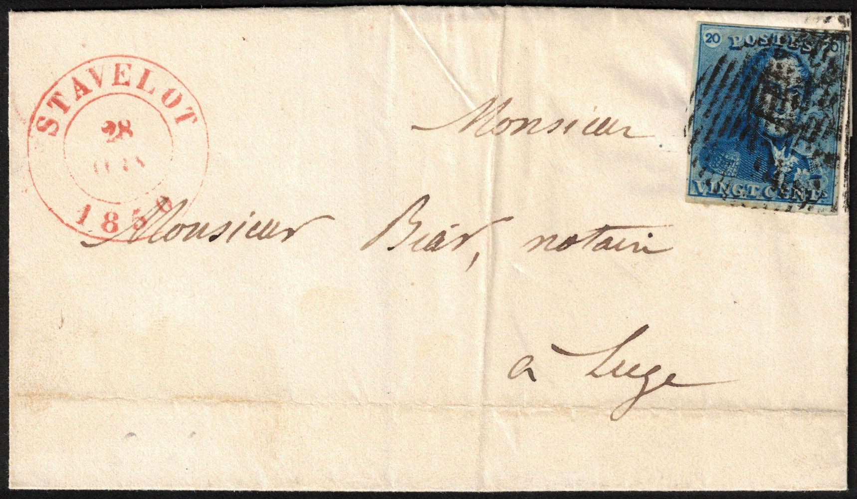2 margé, obl P 112 + càd Stavelot 28/6/1850 sur LSC vers Liège.