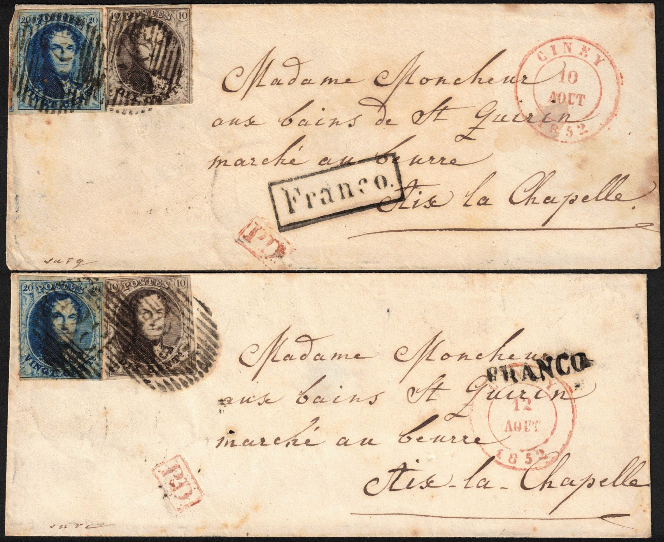 6-7 obl P 28 + càd Ciney 10 et 12.8/1852 + franco (linéaire et encadré) sur 2 enveloppes vers Aix la Chapelle.