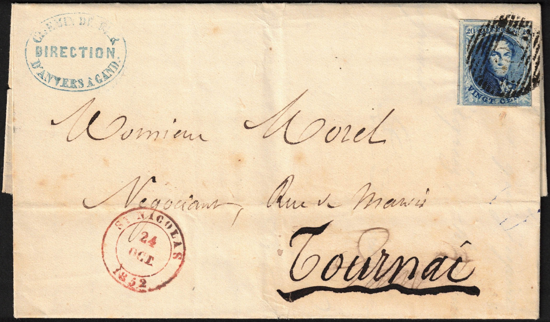 7 margé + voisins obl P 105 + càd St Nicolas 24/10/1852 sur LAC de la Direction Cfer d'Anvers à Gand, cachet en bleu, (concerne réclamation, litige inscrit au verso) vers Tournai, càd verso.