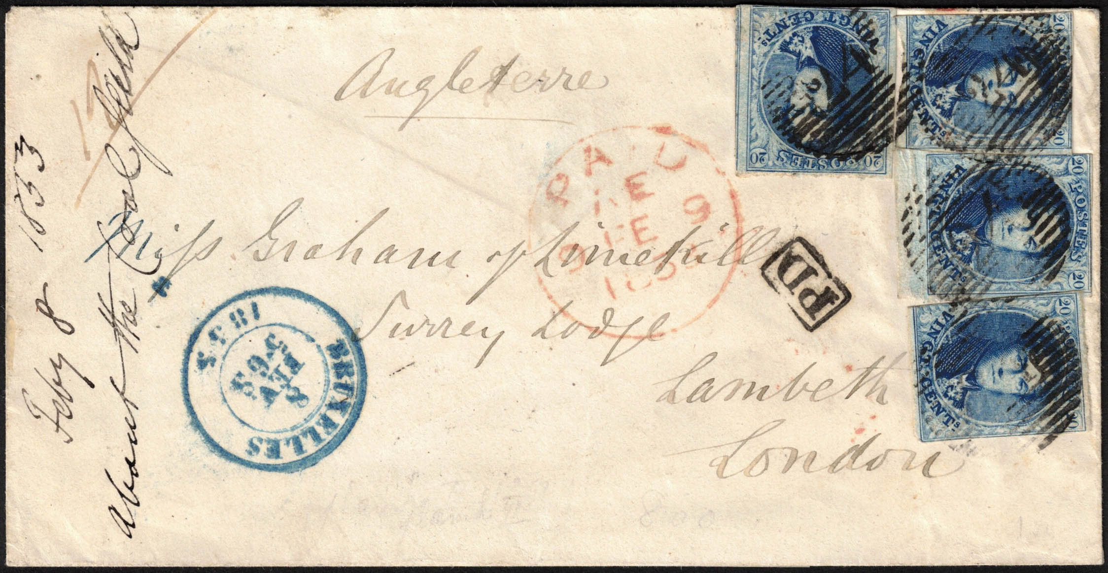 7, 4 exemplaires diversement margés, obl P 24 + càd Bruxelles 8/2/55 vers Londres. Verso : France par Quiévrain N° 1 et arrivée.