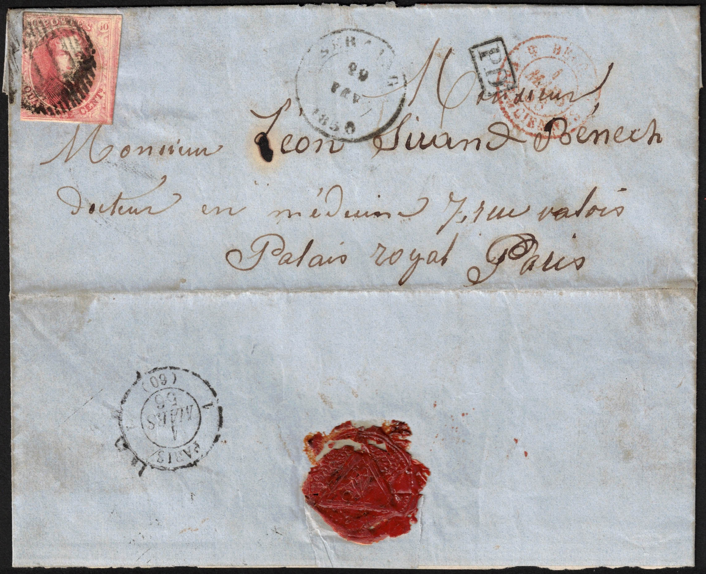 8 margé + voisin obl D 11 + càd Seraing 29/2/1856 sur LAC vers Paris, càd verso 1/3.