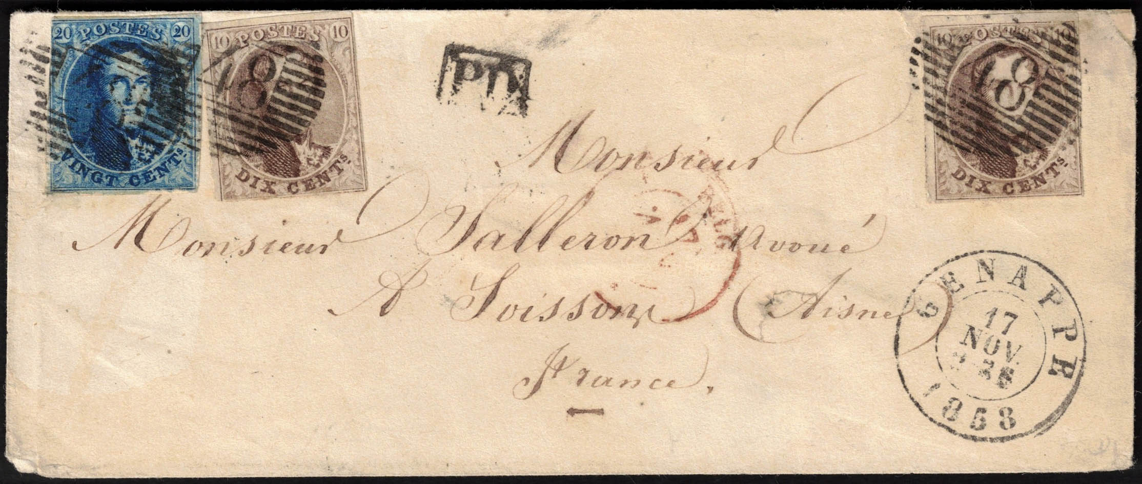 10Ax2-11A obl P 48 + càd Genappe 17/11/58 vers Soissons, France. Ambt et arrivée verso.