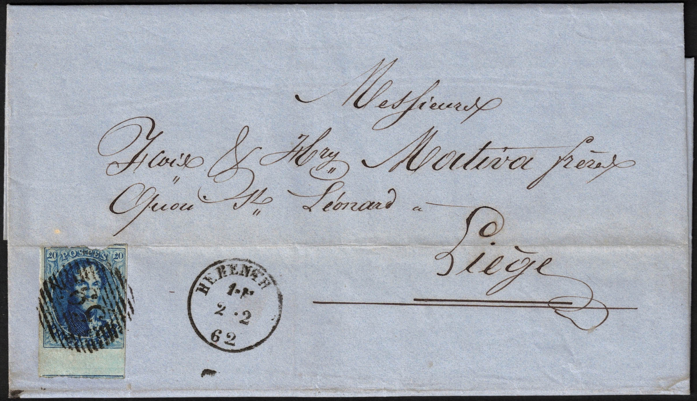 11 touché interpanneaux bord inférieur obl P 59 + càd Herenthals 2/2/62 sur LAC vers Liège. R.R.