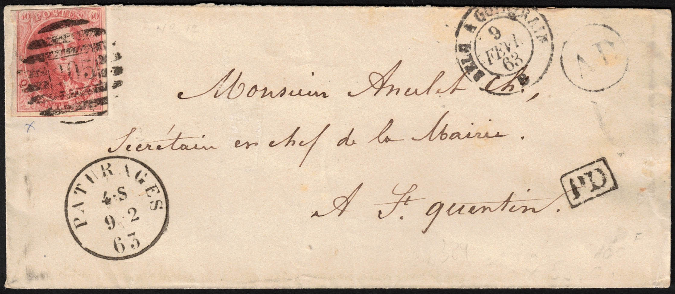 12 au filet bord supérieur obl 8 barres P 205 + càd Paturages 9/2/63, boite AD, enveloppe vers St Quentin, France. Càd arrivée verso 10/2.