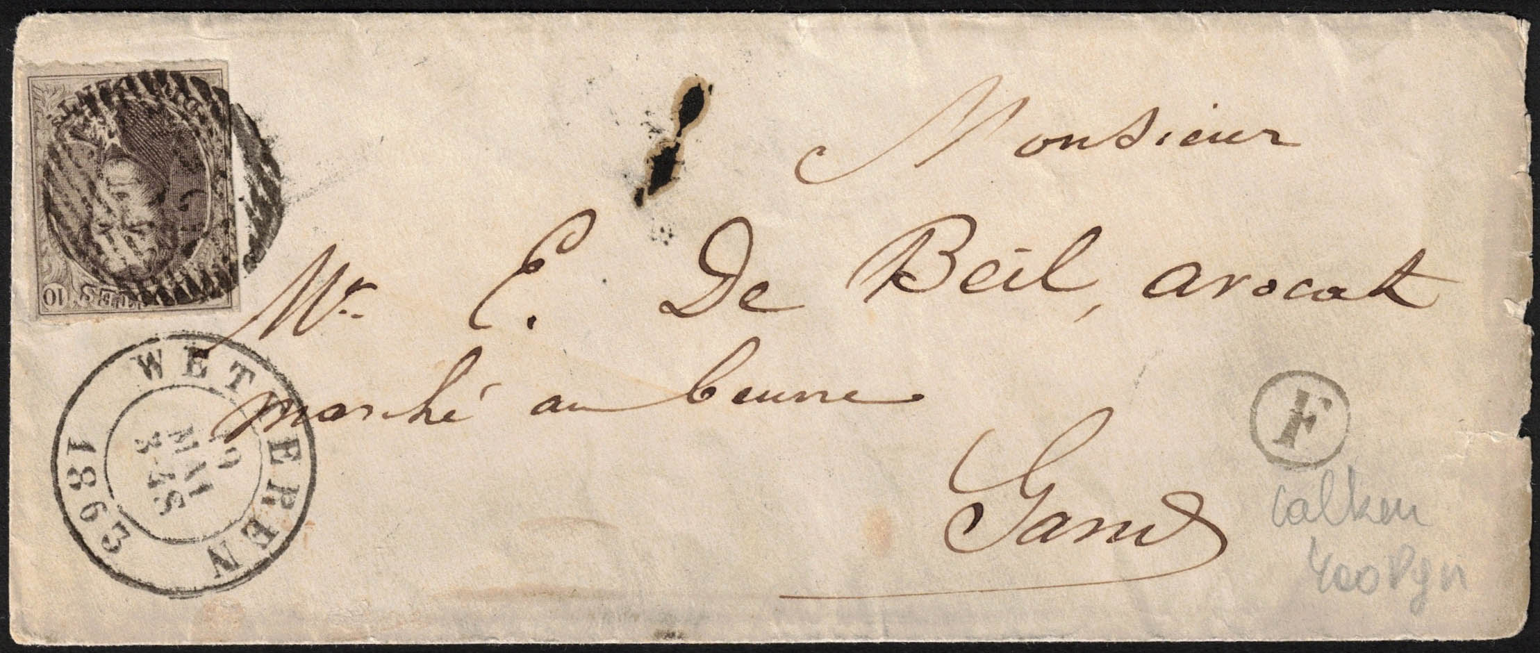 10 bien margé obl P 132 + càd Wetteren 19/5/1863, boite F (Kalken) sur env vers Gand.