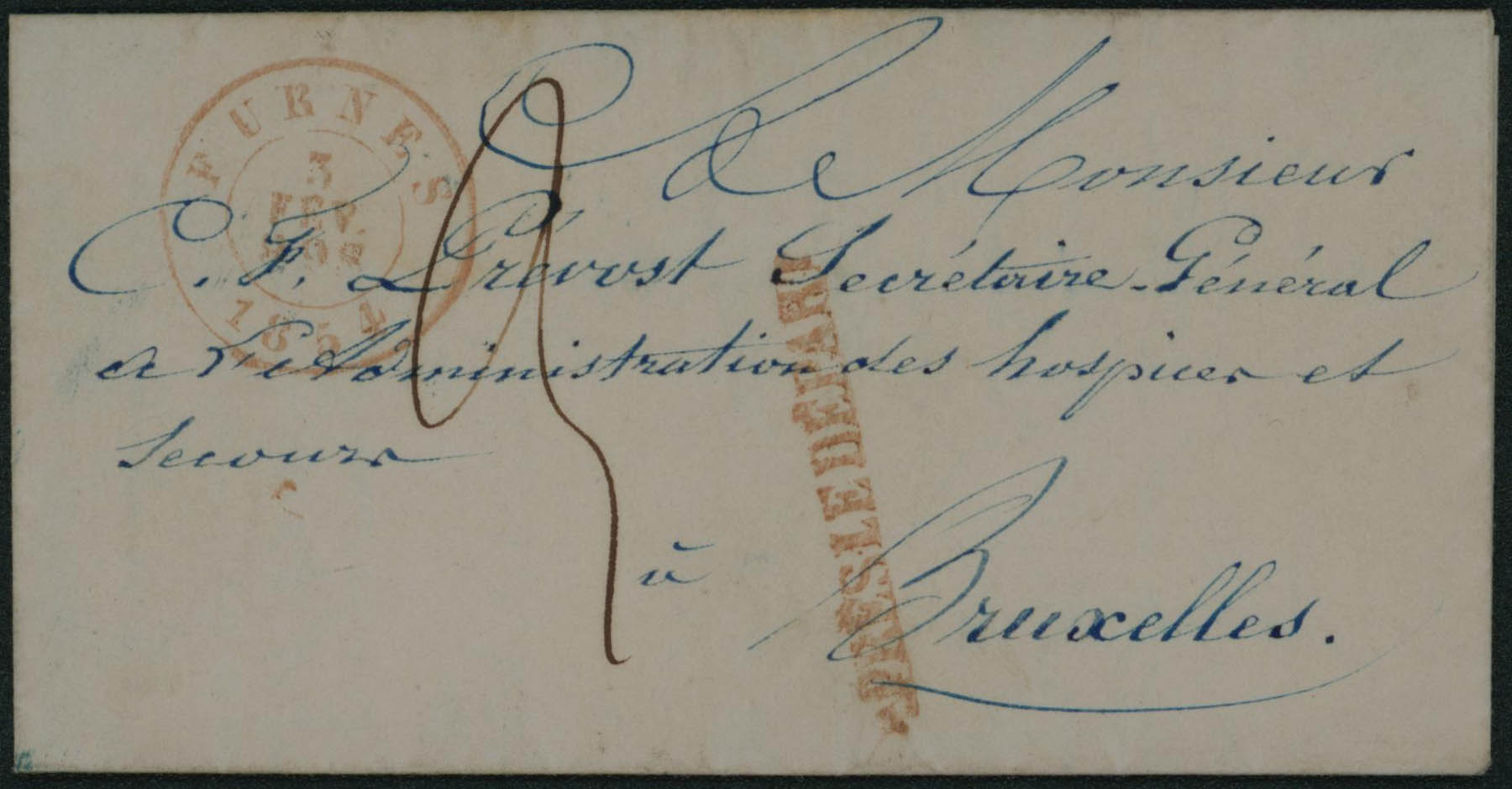LAC Furnes 3/2/1854 vers Bruxelles. Griffe en rouge en grosses lettres 'Après le départ'. Port 3 décimes. Càd arrivée au verso le 4/2.'