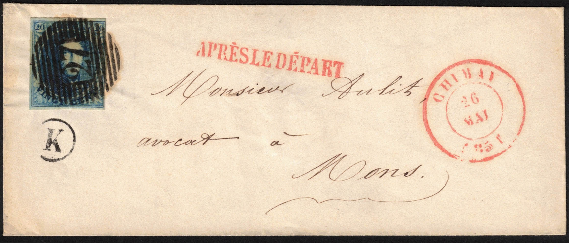 4 margé obl P 27 + càd Chimay 26/5/1852, boite K de Bourlers, griffe en rouge 'Après le départ' sur enveloppe vers Mons, càd verso.'