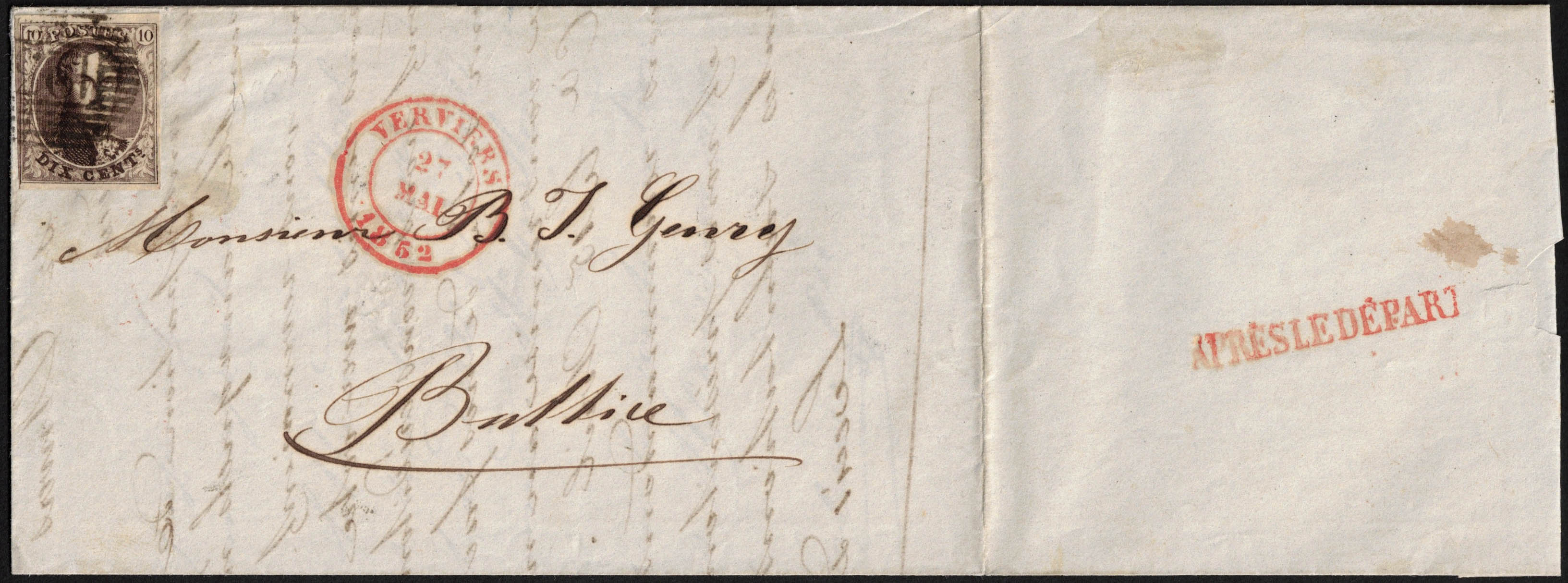 6 obl P 123 + càd Verviers 27/5/1852, griffe en rouge au verso 'Après le départ', LAC vers Battice, càd Herve 27/5.'