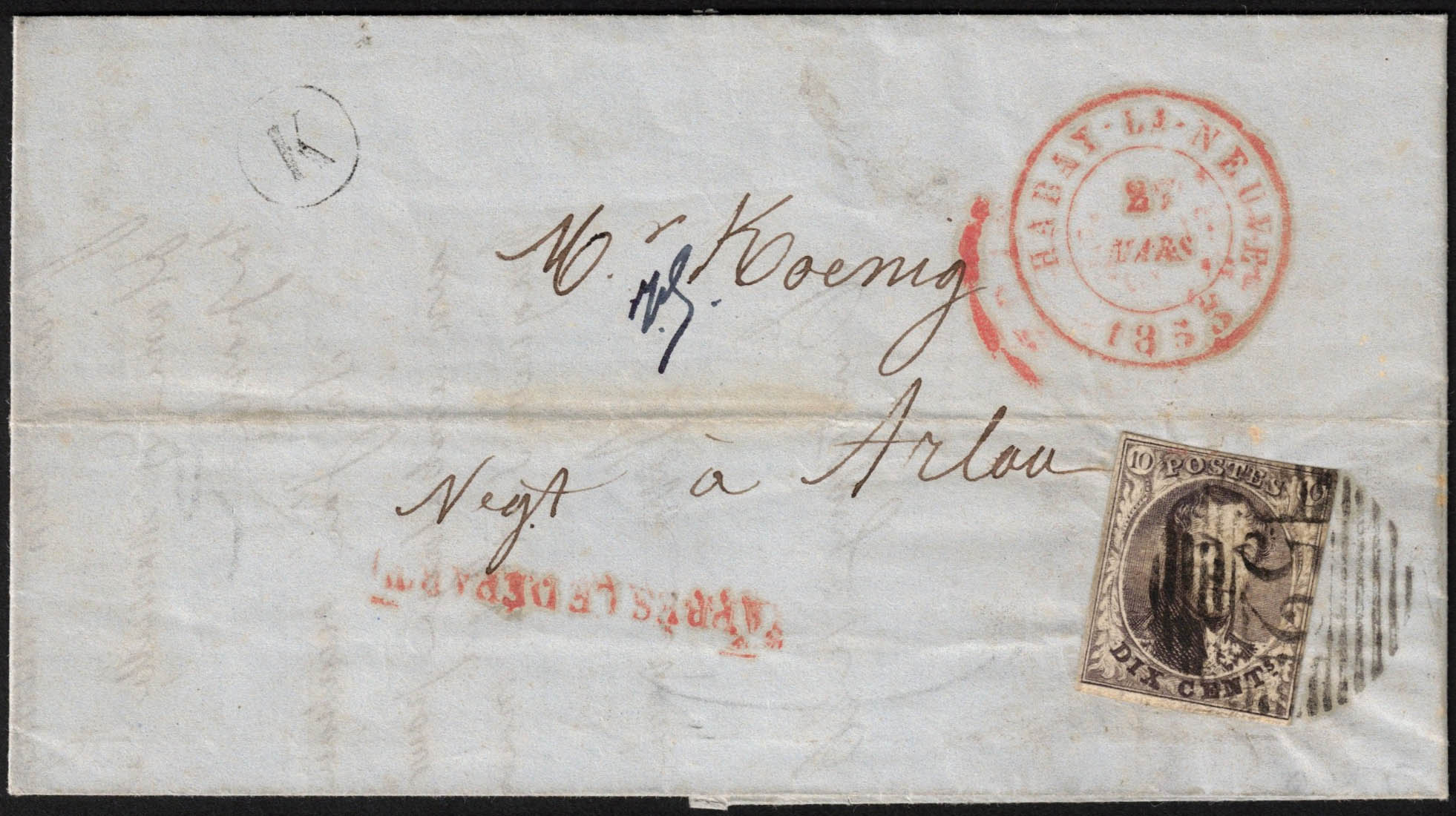 6 margé obl P 52 + càd Habay-la-Neuve 27/3/1853, boite K de Tintigny, griffe encadrée en rouge 'Après le départ' sur LAC vers Arlon, càd verso 28/3.'
