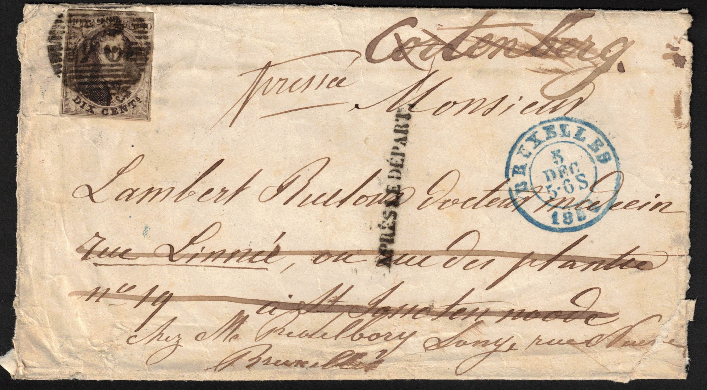 6 touché obl P 24 + càd Bruxelles 5/12/1854, griffe en noir 'Après le départ', enveloppe vers St Josse-Ten-Noode. Au verso 'Déboursé Bruxelles' et suivi.'