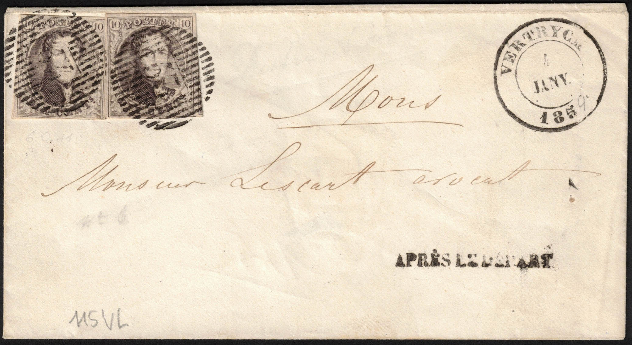 6x2 margés obl D 53 + càd Vertryck 4/1/1854, griffe en rouge 'Après le départ' sur enveloppe vers Mons, càd verso 5/1.'