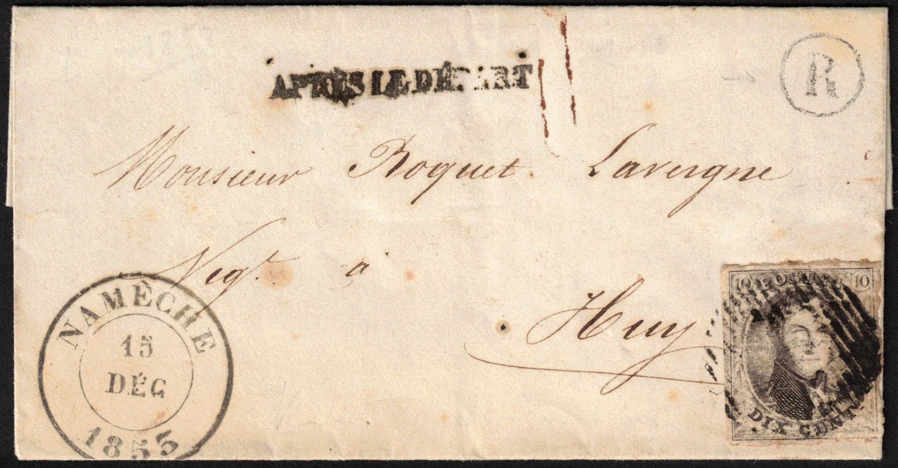 6 touché obl D 1 + càd Namêche 15/12/1855, boite R de Vezin, griffe en noir 'Après le départ' sur LAC vers Huy, càd verso 15/12.'