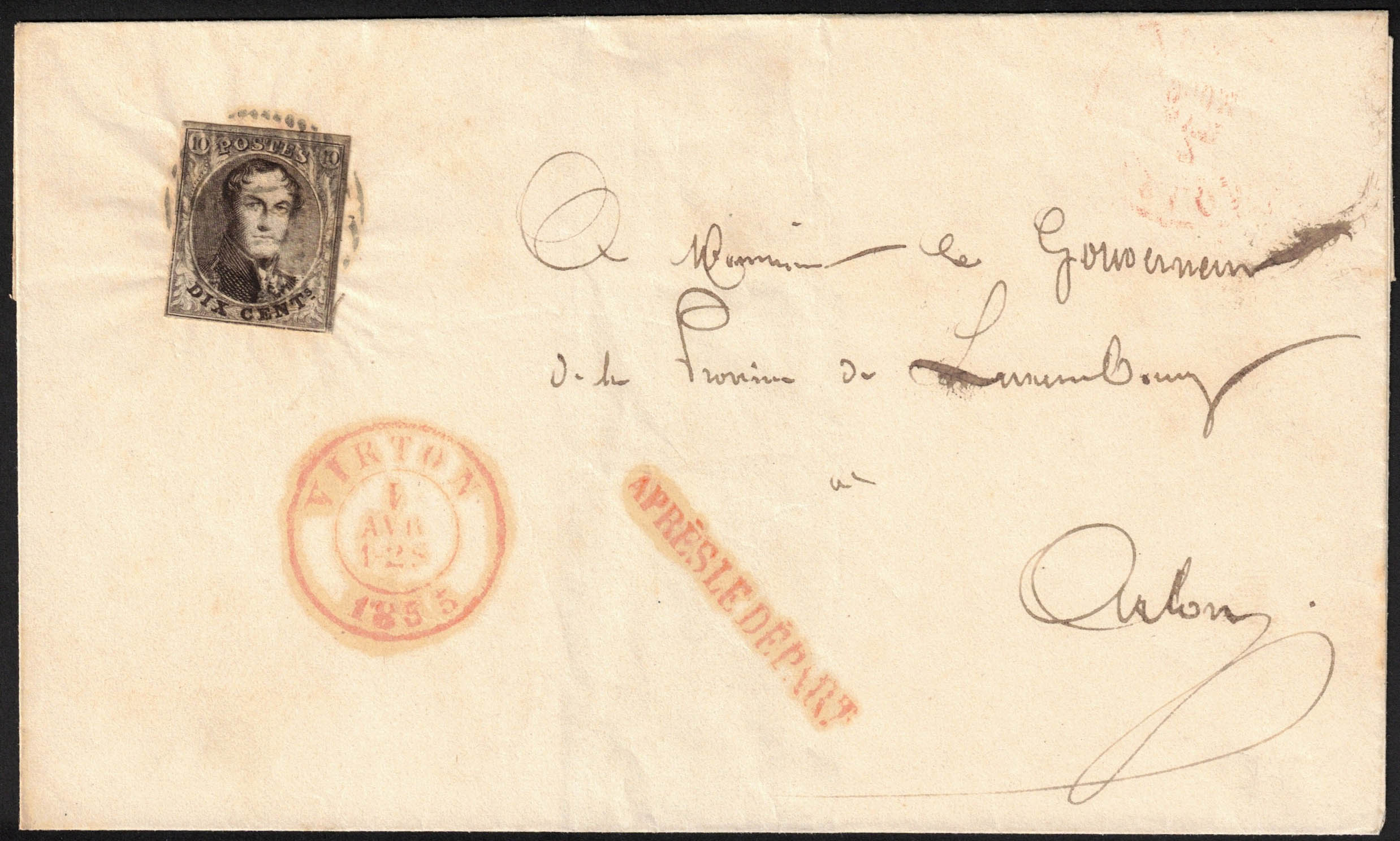 6 margé obl P 126 + càd Virton 1/4/1855, griffe en rouge 'Après le départ' sur LSC vers Arlon, càd verso 2/4.'