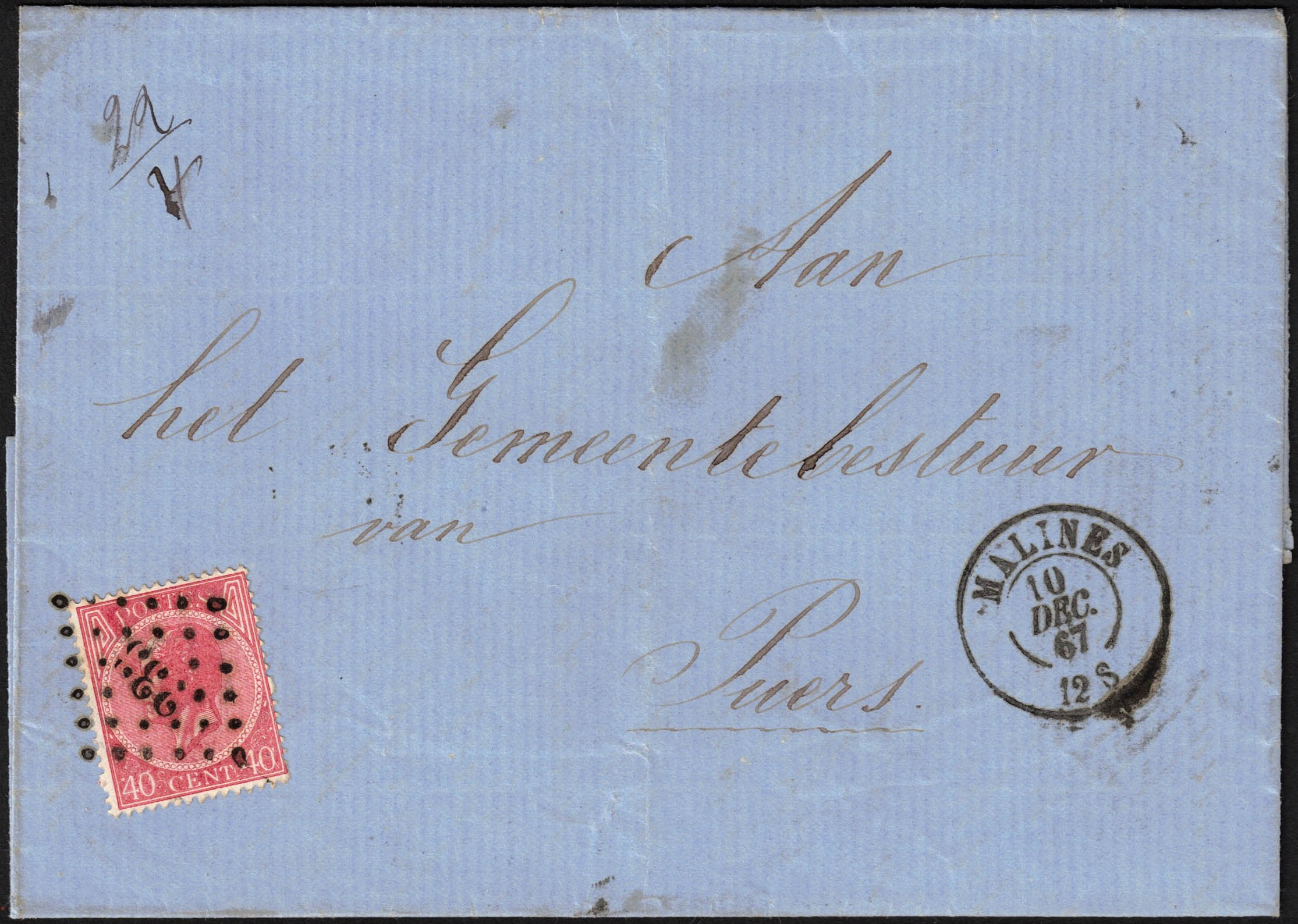 20 obl Lpts 233 + càd Malines 10/12/67 sur LAC vers Puers, càd verso 10/12. 22 grs/4 ports pour une distance de moins de 30 kms. Rare.