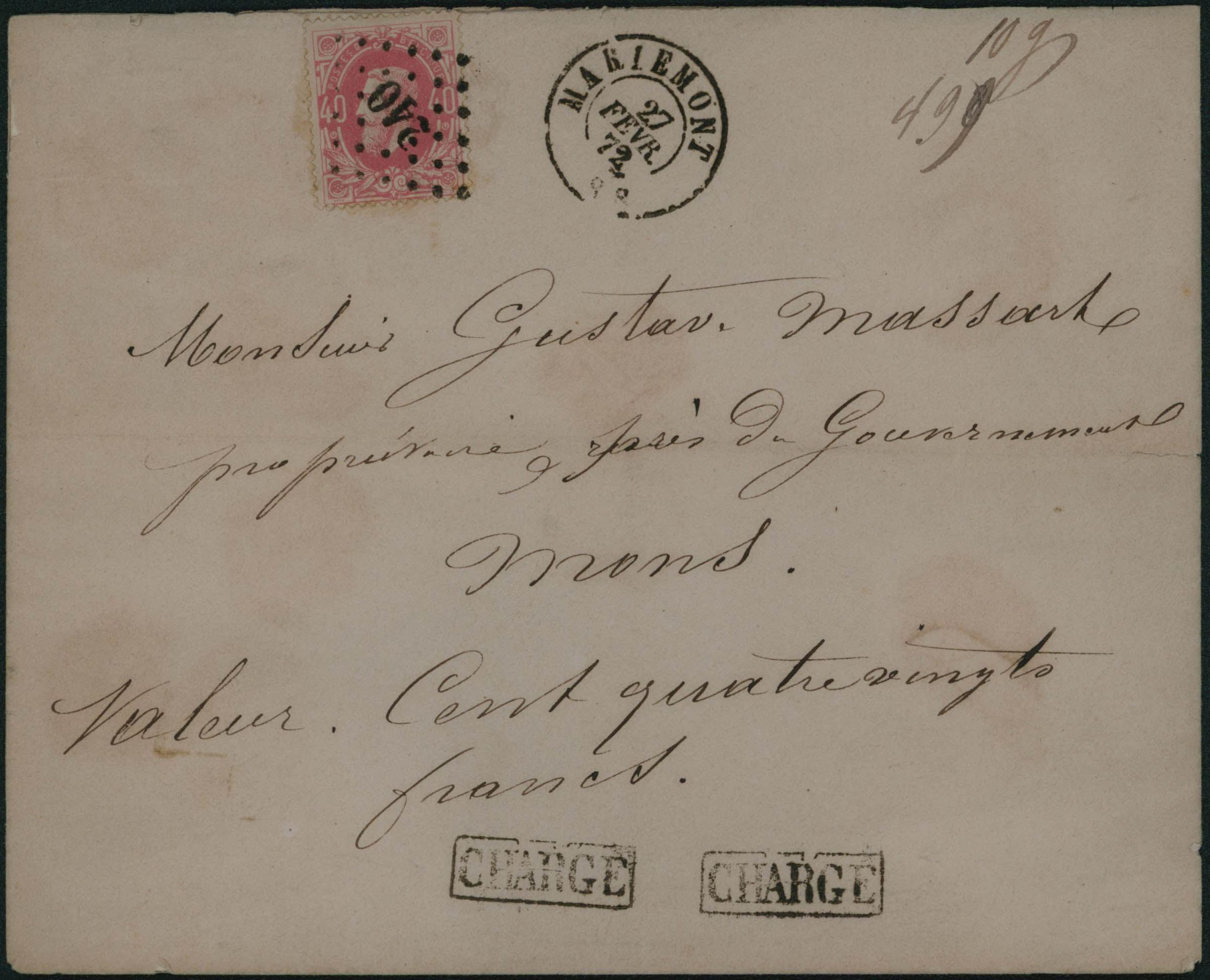 34 obl Lpts 240 + càd Mariemont 27/11/1872 au recto d'un pli chargé (valeur déclarée 180 Frs) - 10 grs - vers Mons, càd verso + cachets de cire.