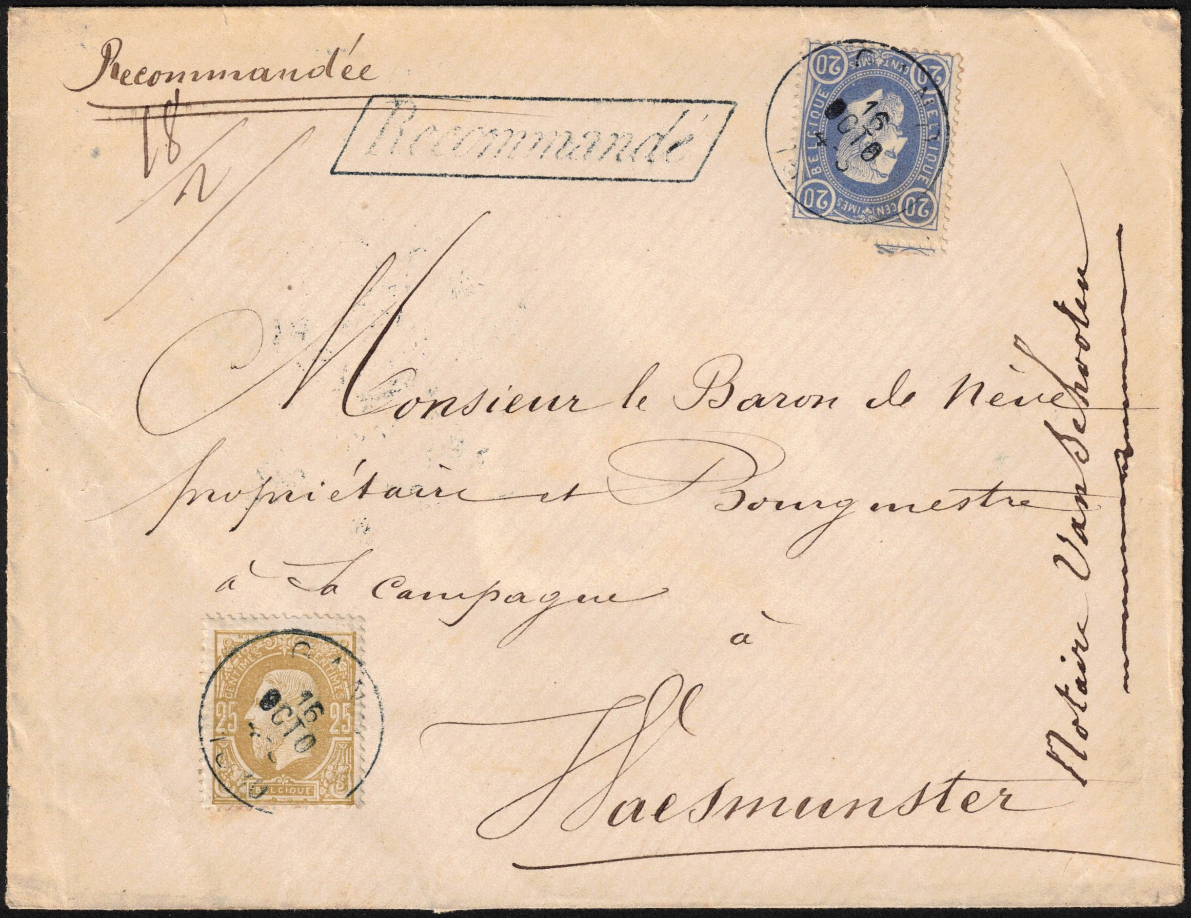 31-32 obl Gand 16/10/1880 en rec - 18 grs/2 ports - vers Waesmunster. Verso càd Gand(Station) 16/10.