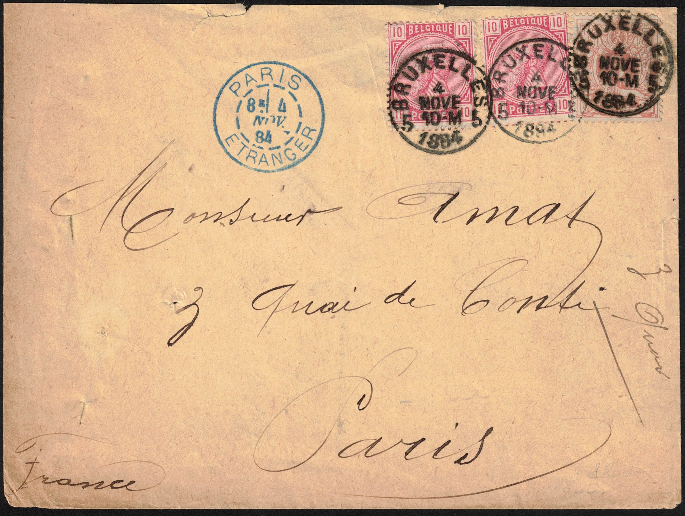 28-38x2 obl sc Bruxelles 5 4/11/1884 vers Paris. Afft combiné peu courant. TB