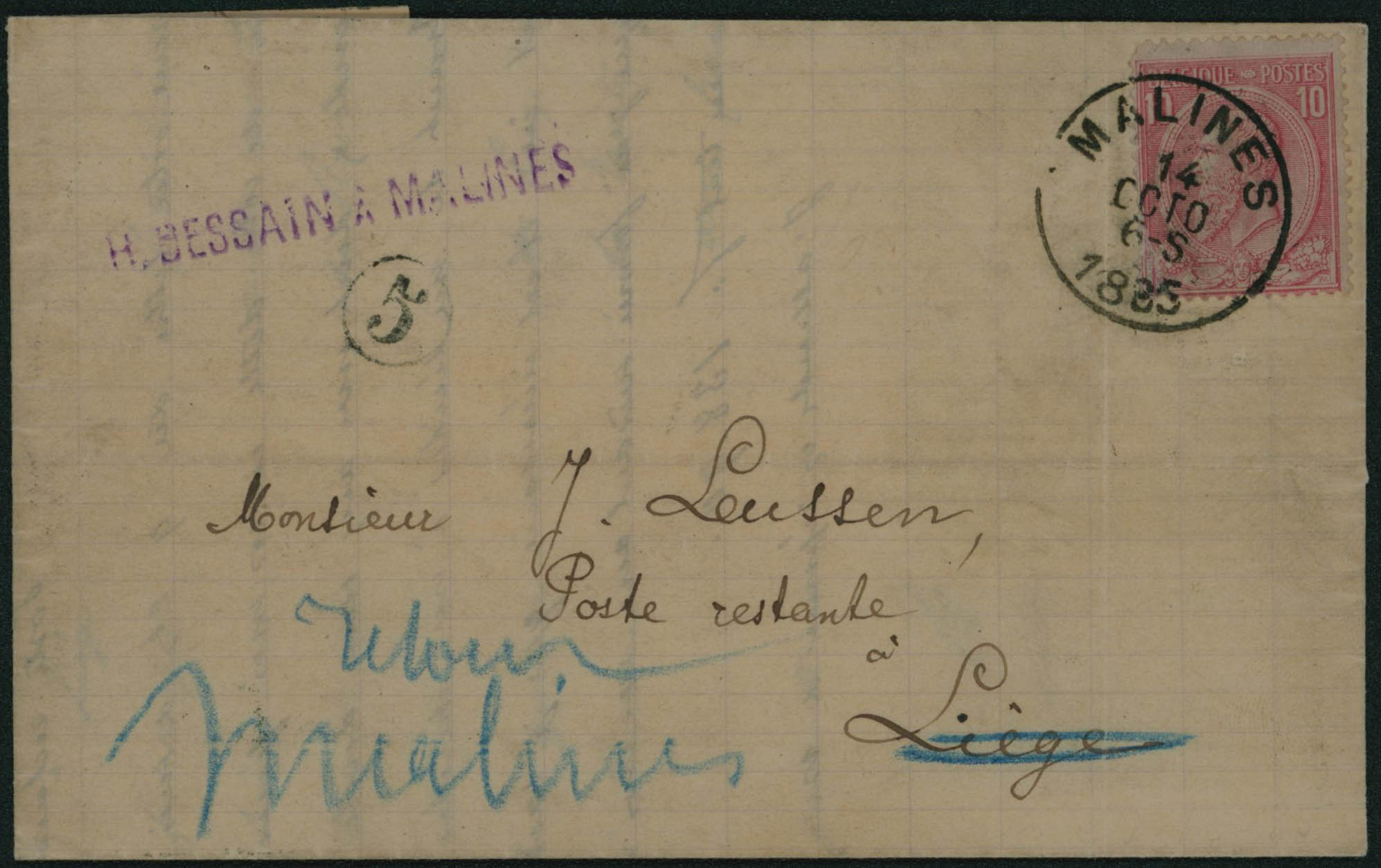 46 obl Malines 14/10/1885 sur LAC vers Liège en poste restante, càd arrivée verso 15/10. Verso griffe 'non retiré dans le délai'. Manuscrit au recto 'retour Malines'. TB'