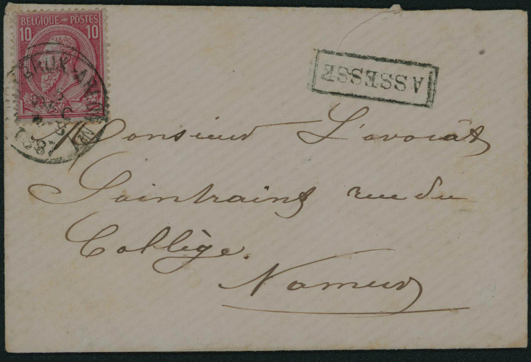 46 obl Ambt Bruxelles-Arlon N° 1 du 5/12/1887 + griffe encadrée Assesse vers Namur, càd verso 5/12.