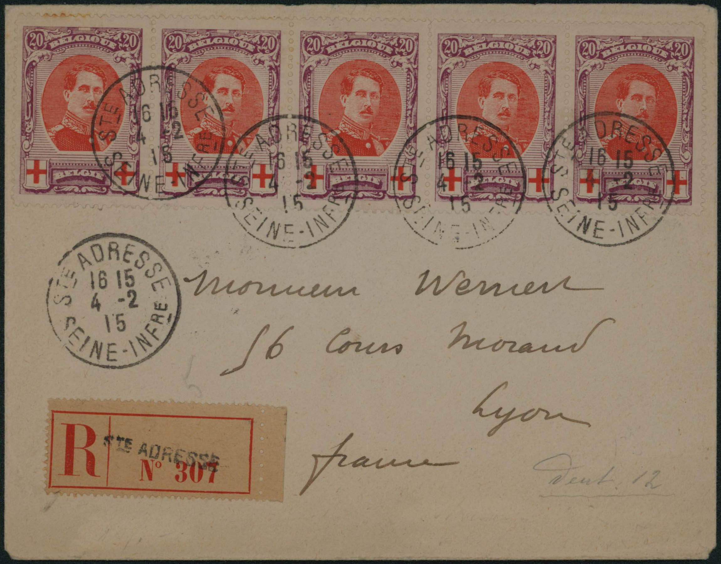 134A (dentelé 12) en bande de 5 en rec Ste Adresse 4/2/15 vers Lyon, càd arrivée verso. Afft peu courant.