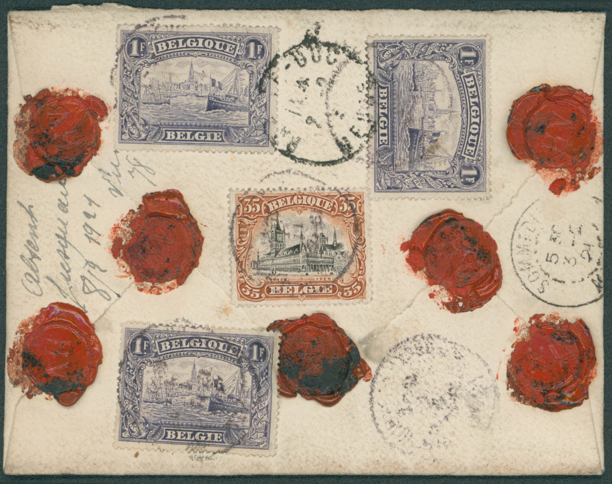 142-145x3 obl Bruxelles au recto d'un pli chargé (valeur déclarée 5600 Frs) - 25grs/2 ports - vers la France, Sommedieue et suivi St Etienne.