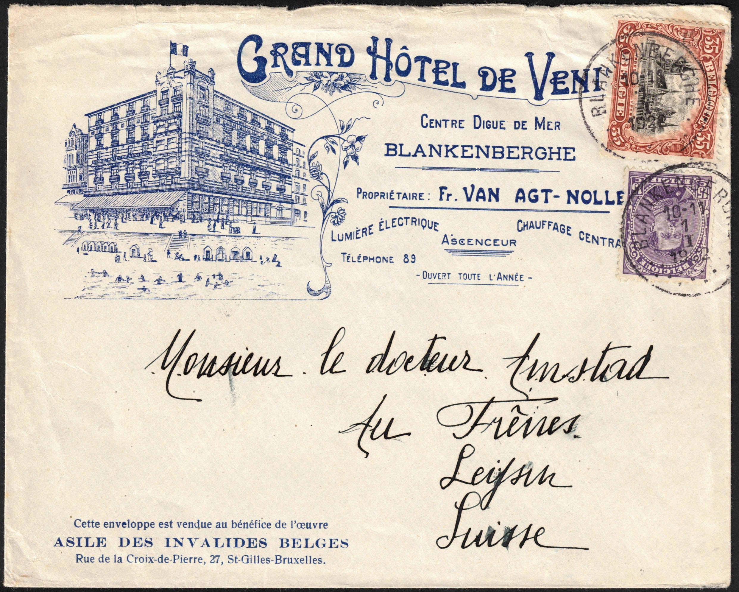 139-142 obl sc Blankenberghe 1/1/1922 sur lettre à en-tête illustrée 'Grand Hôtel de Venise Blankenberghe' vers Leysen, Suisse. Superbe.'