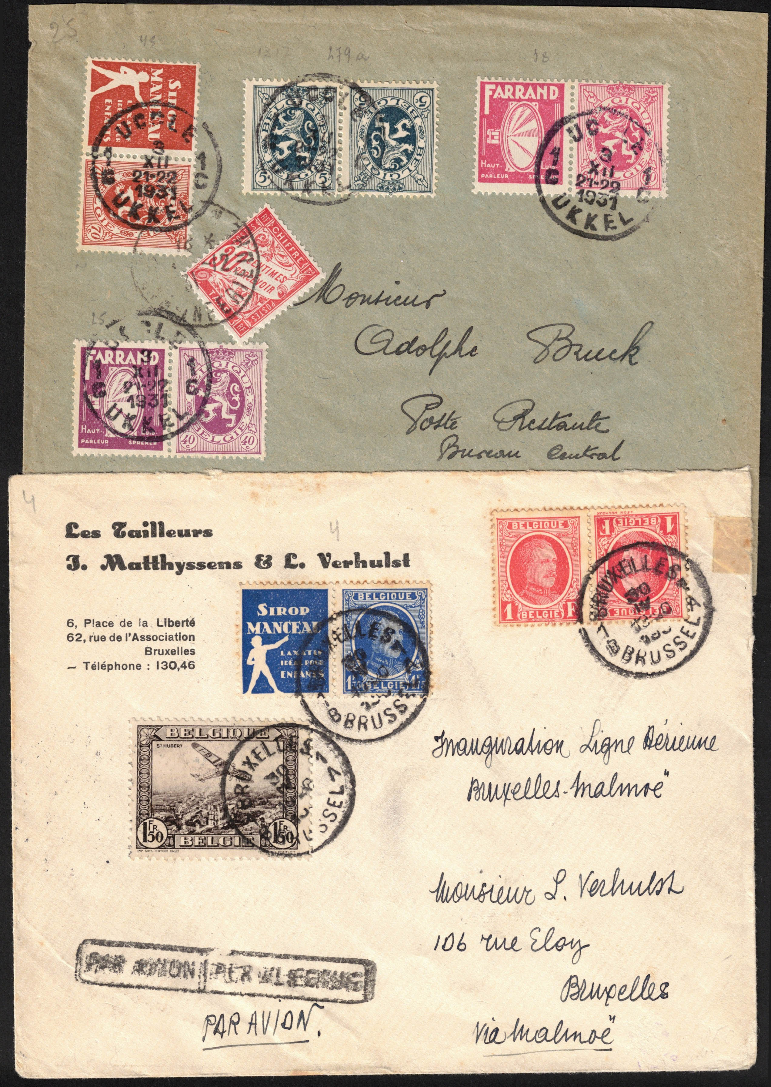 1931/1953 - 6 lettres, 1 taxée + 1 carte-récépissé, affts par timbres publicitaires. A voir.