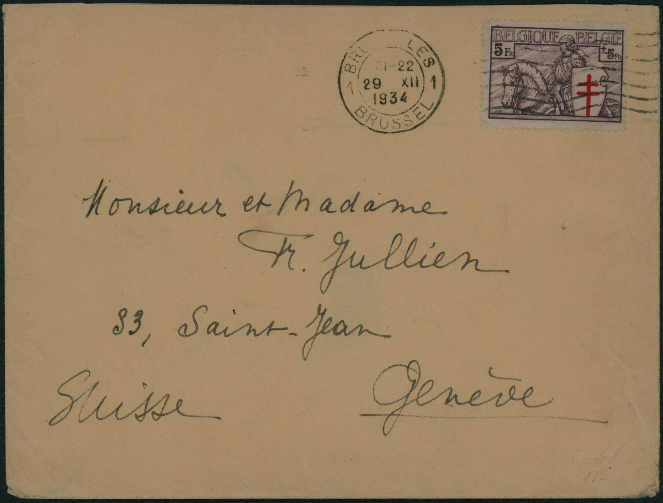 400 obl Bruxelles 29/12/34 vers Genève, Suisse. Afft peu courant.