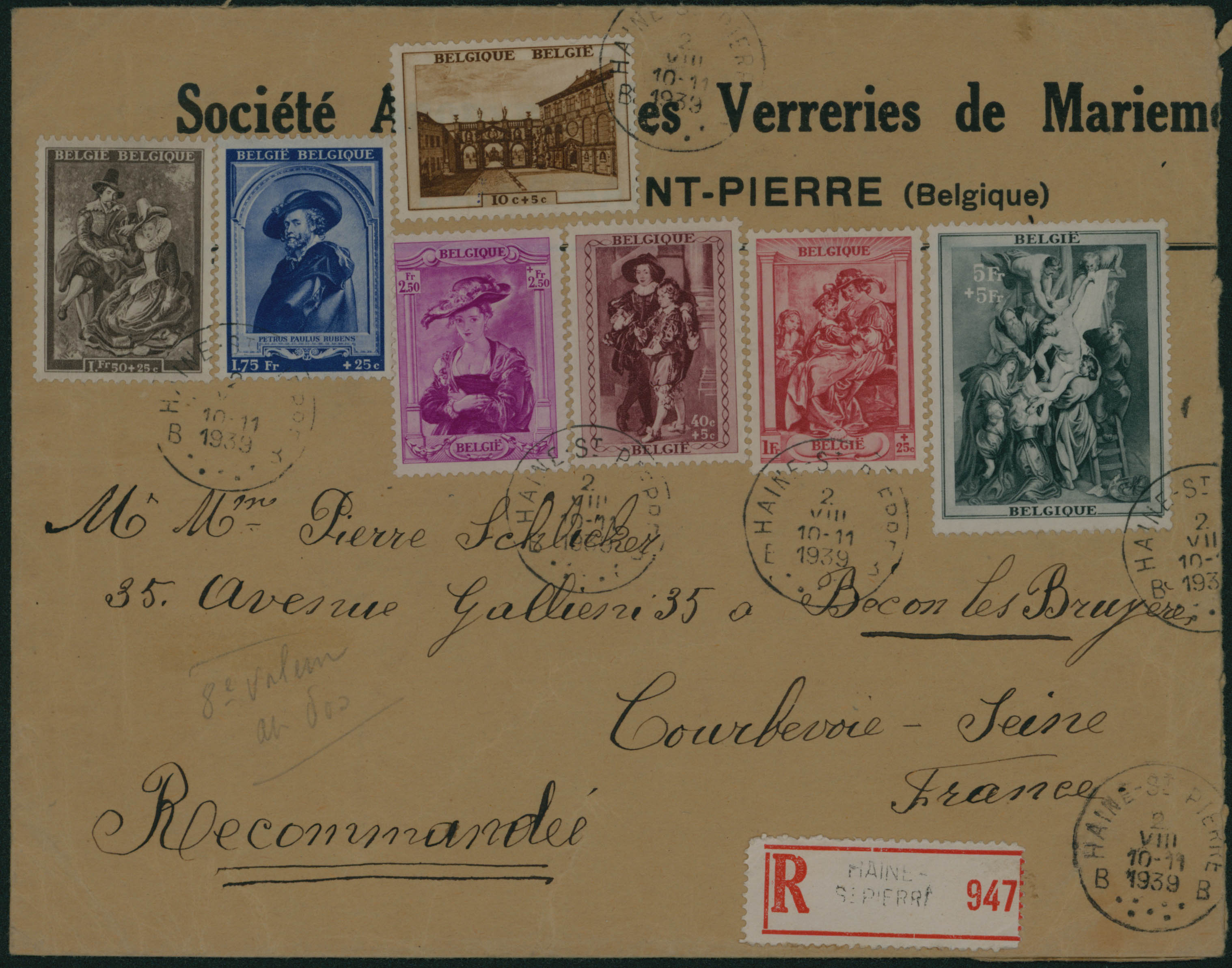 504 à 511 (le 506 au verso) obl Haine St Pierre 2/8/1939 en rec vers Courbevoie, France. Càd arrivée au verso.
