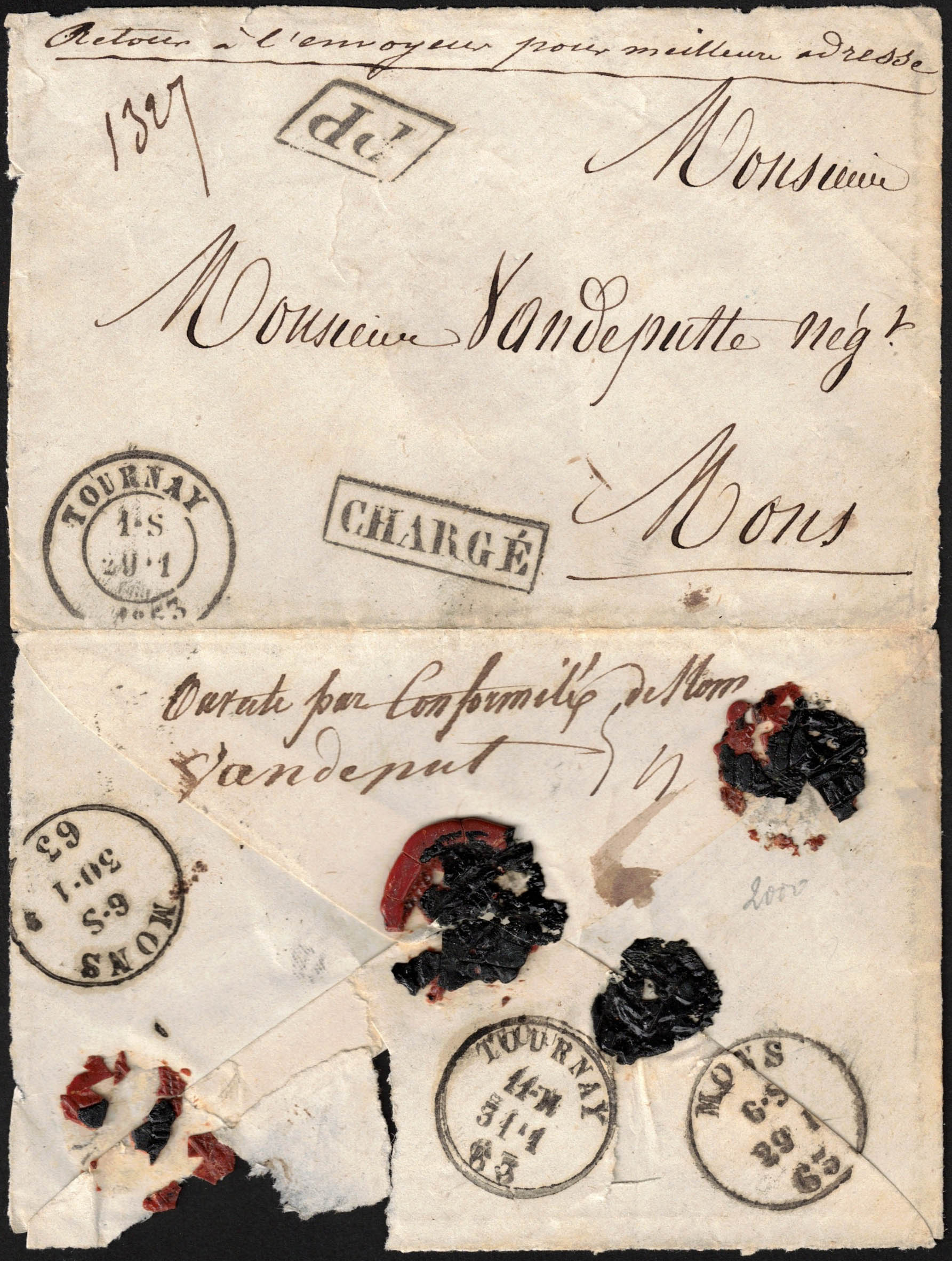Env de Tournay 20/1/1863 vers Mons. Griffes en noir 'Chargé' et 'PP'. Manucrit 'Retour à l'envoyeur pour meilleure adresse'. Verso cachets de cire, càd Mons 29/1, 'Ouverte par conformité de Mons' + signature, càd Mons 30/1 et Tournay 31/1. TB'