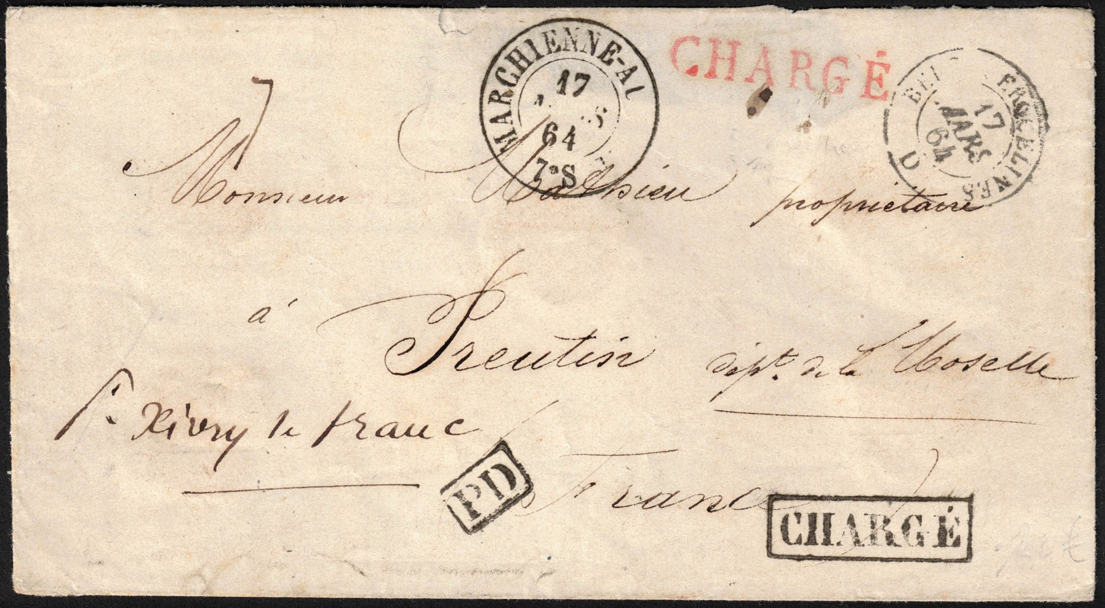 Env de Marchienne 17/3/1864 ver Preutin, France. Griffes encadrées en noir 'Chargé' et 'PD'. Griffe en rouge 'Chargé'. 'Belg./Erquelines D 17/3. Au verso cachets de cire, Midi III du 17/3, Paris à Forbach 18/3, décompte français.'