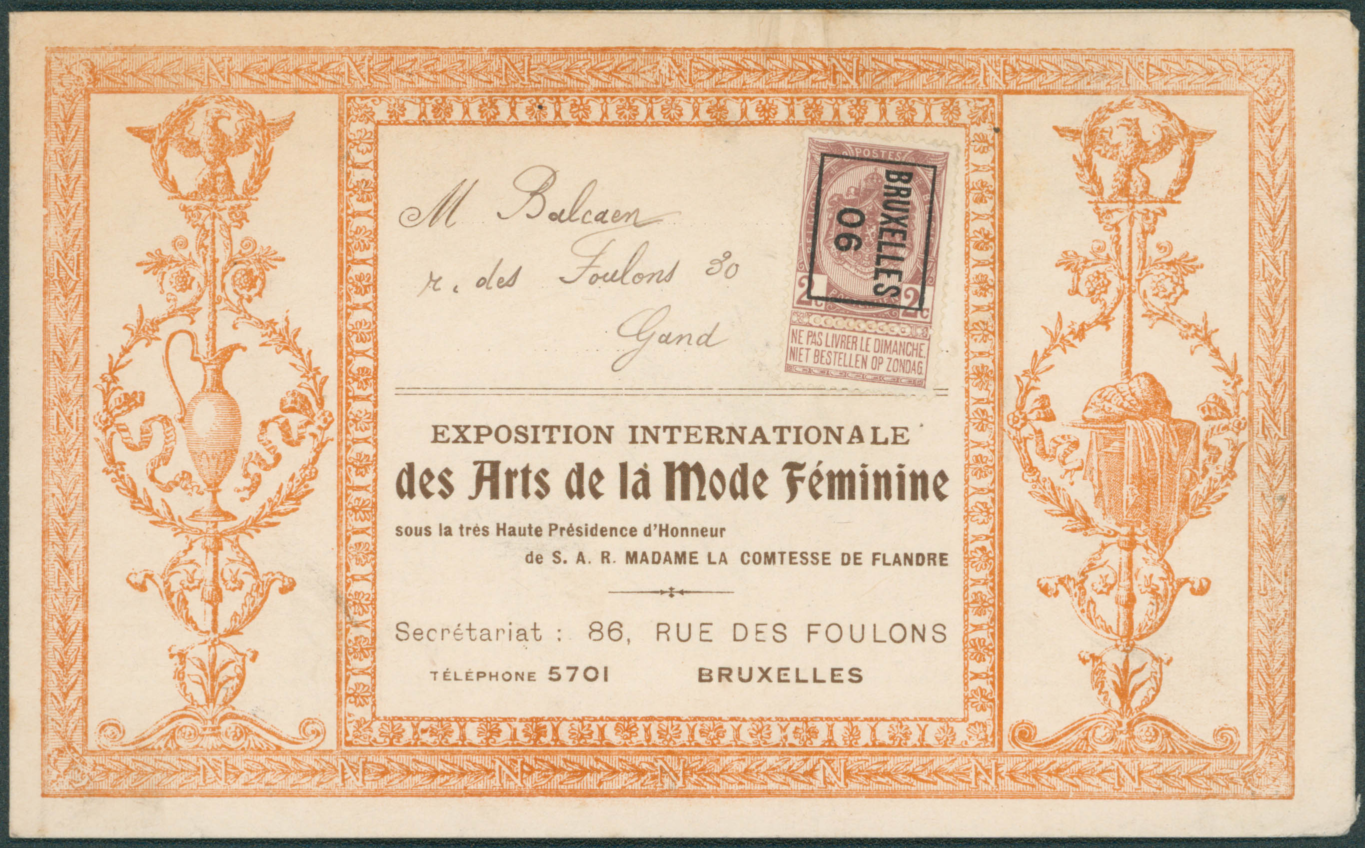 Préo 2c Bruxelles 06 sur enveloppe illustrée recto/verso 'Exposition Internationale des Arts de la Mode Féminine' vers Gand.'