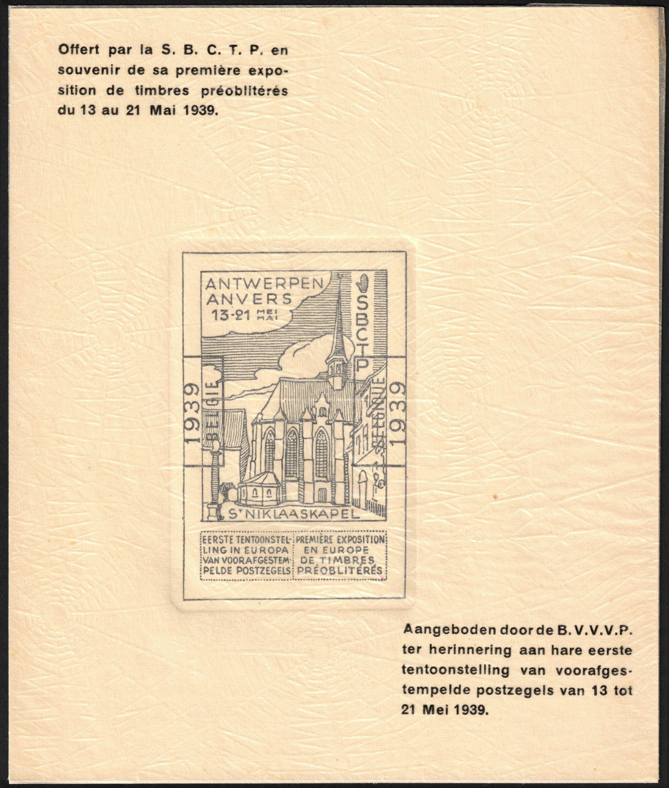Document officiel dans pochette offert par la S.B.C.T.P. en souvenir de sa première exposition de timbres préoblitérés du 13 au 21 Mai 1939.