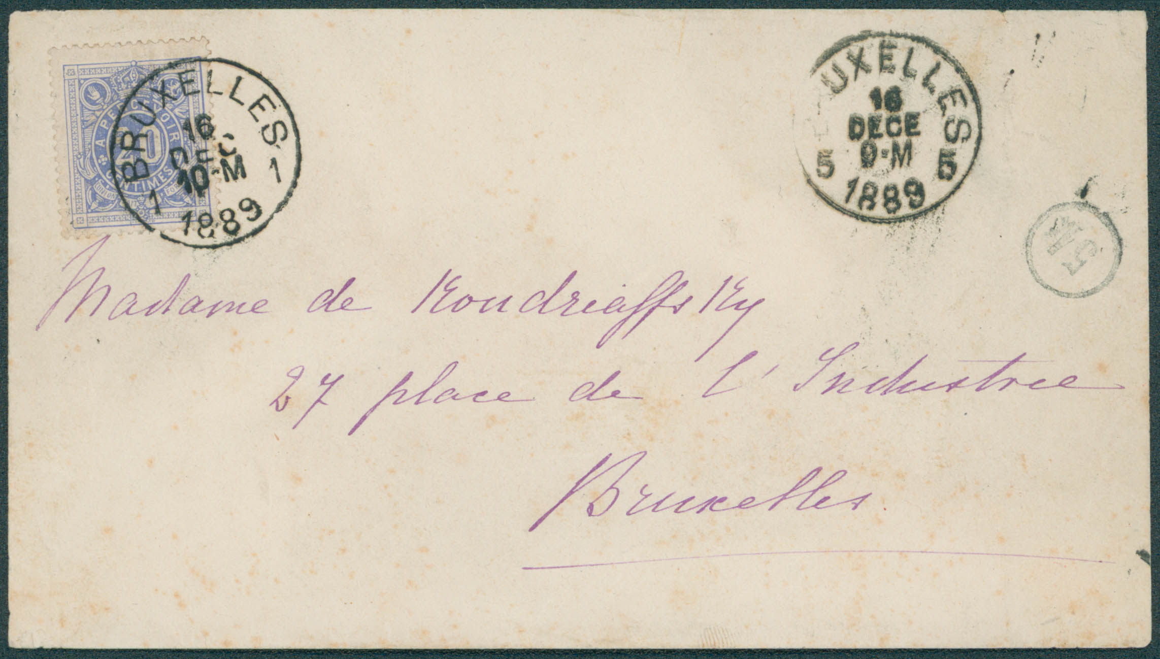 Env non timbrée obl Bruxelles 16/12/1889 vers la ville. Taxe 20c par Tx 2 le 16/12.